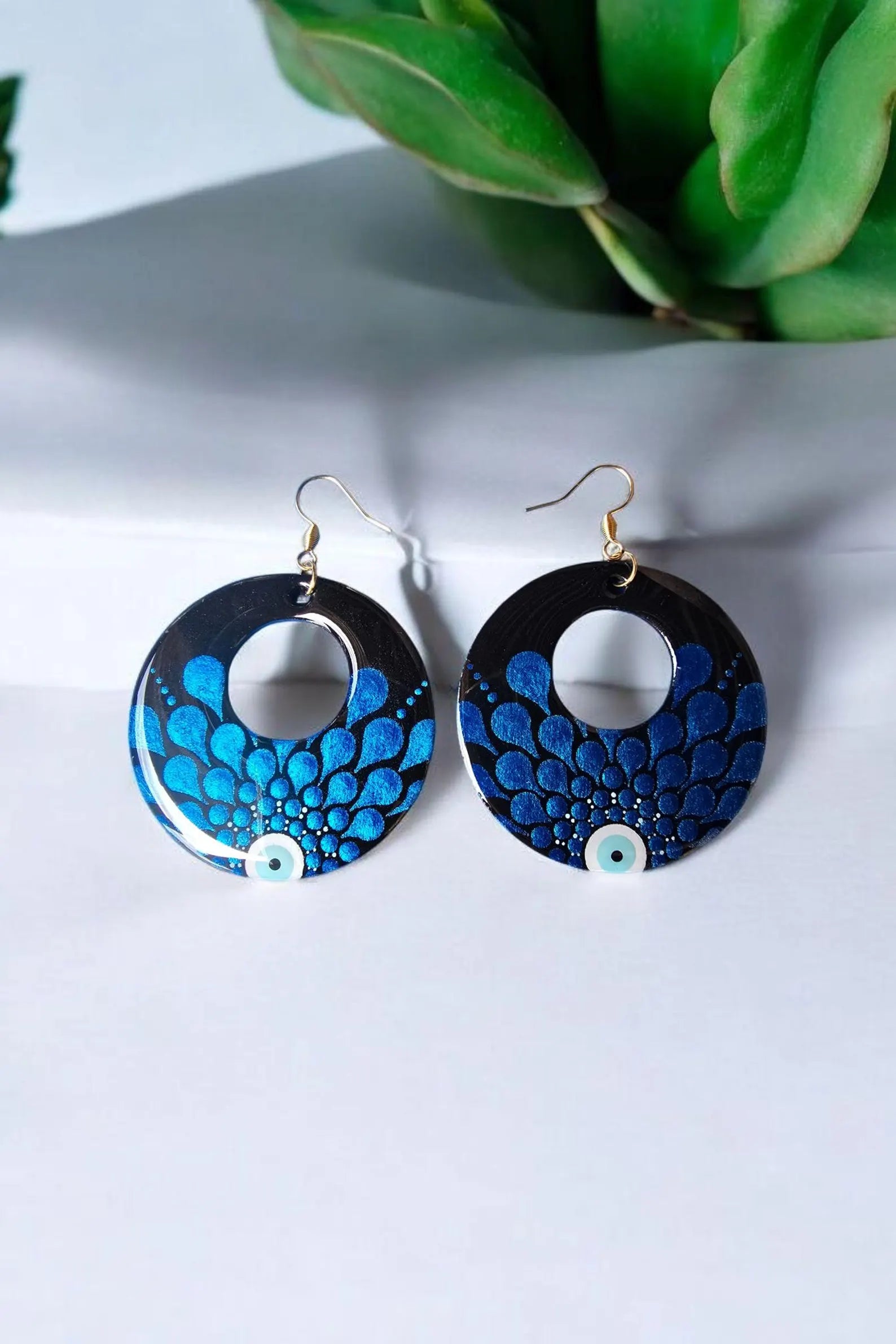 Boucles d’Oreilles en Bois Œil Grec Peintes à la Main – Pointillisme & Résine Brillante