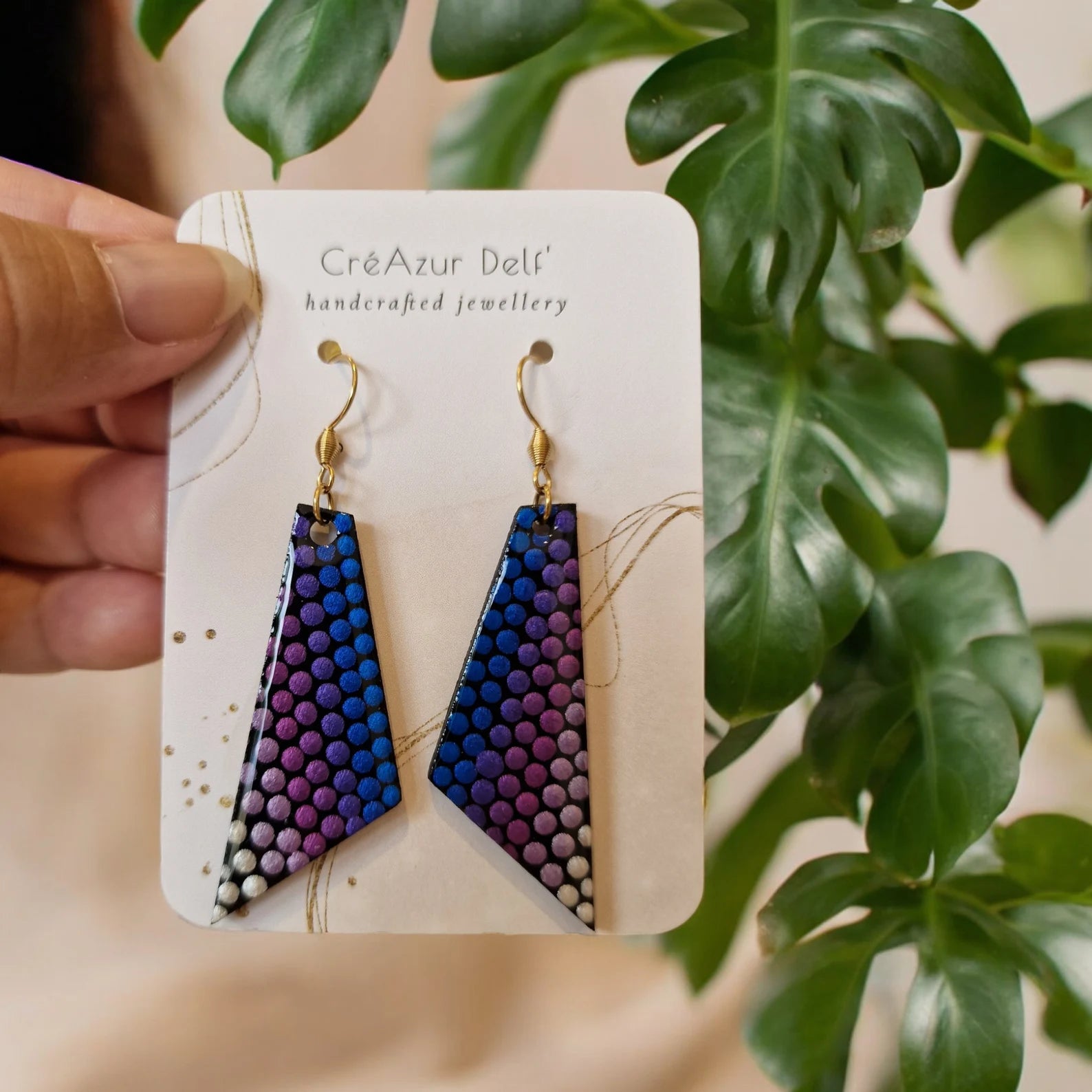 Ajoutez une note artistique et élégante à votre style avec ces boucles d'oreilles artisanales en bois, peintes à la main en dégradés violet, fuchsia et bleu selon la technique du pointillisme. Chaque face est recouverte d'une résine brillante non toxique, offrant à la fois protection et éclat aux couleurs.