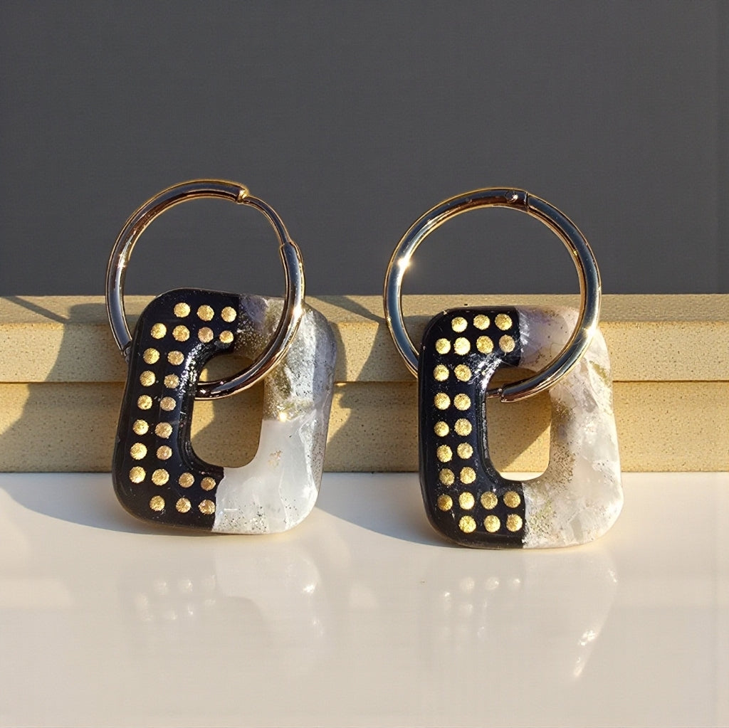 Boucles d’oreilles pampilles rectangulaires en pâte polymère – blanc marbré et noir pointillisme doré