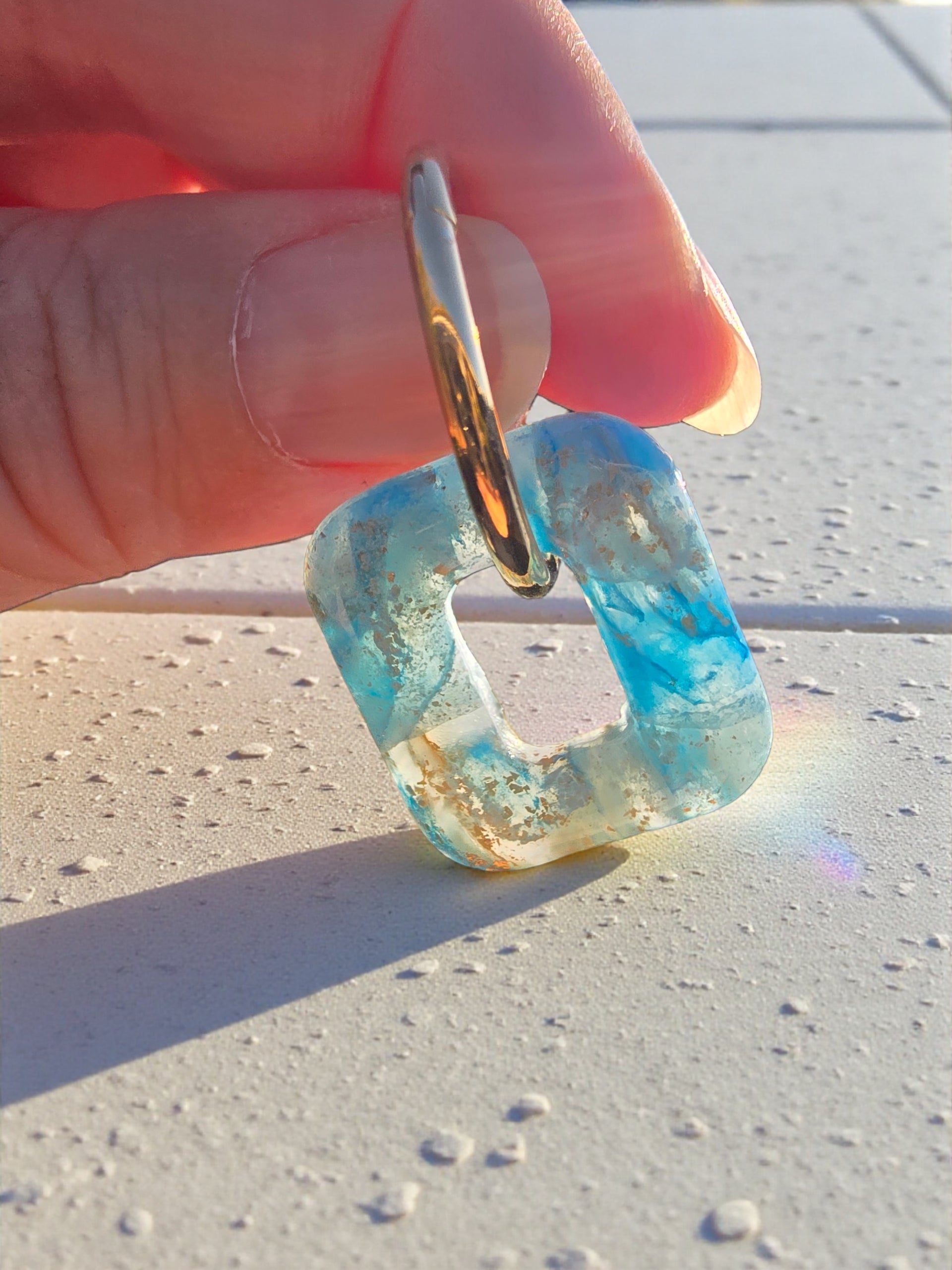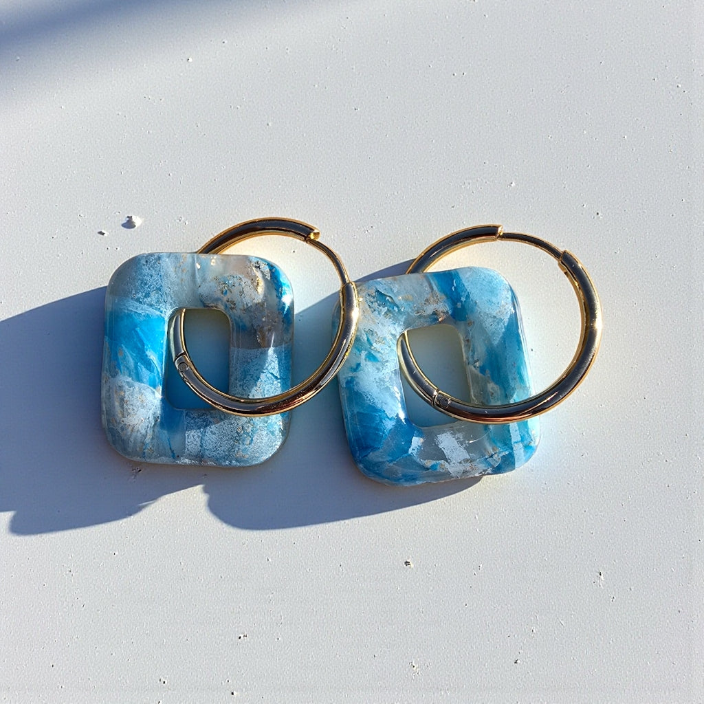 Leur teinte bleu marbrée capte la lumière et apporte une note fraîche et élégante, parfaite aussi bien pour un look quotidien que pour une occasion spéciale. Les créoles en acier inoxydable 304L doré garantissent une excellente résistance à l’usure et conviennent aux oreilles sensibles.