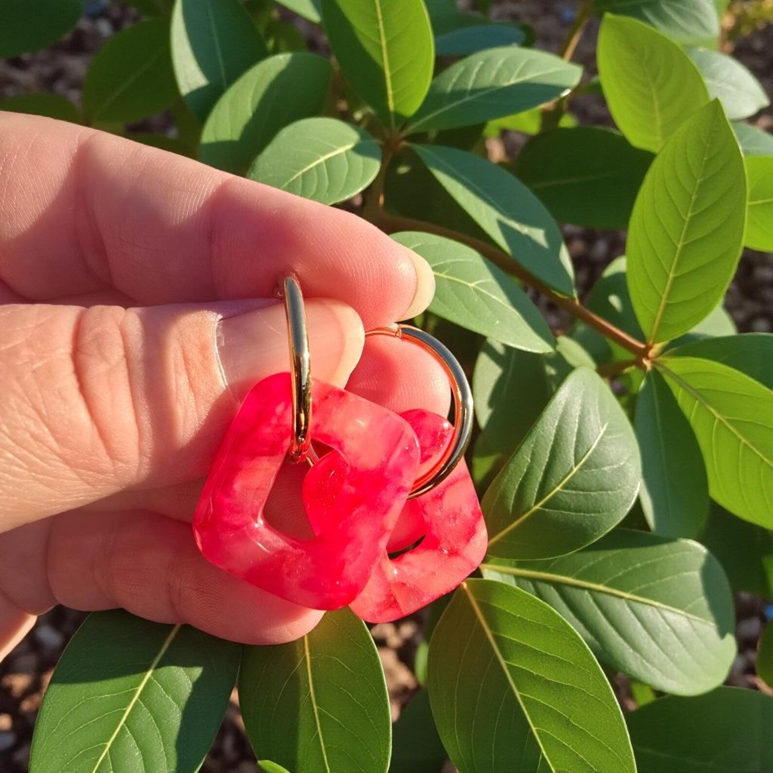 Leur teinte rose marbrée capte la lumière et apporte une note fraîche et élégante, parfaite aussi bien pour un look quotidien que pour une occasion spéciale. Les créoles en acier inoxydable 304L doré garantissent une excellente résistance à l’usure et conviennent aux oreilles sensibles.