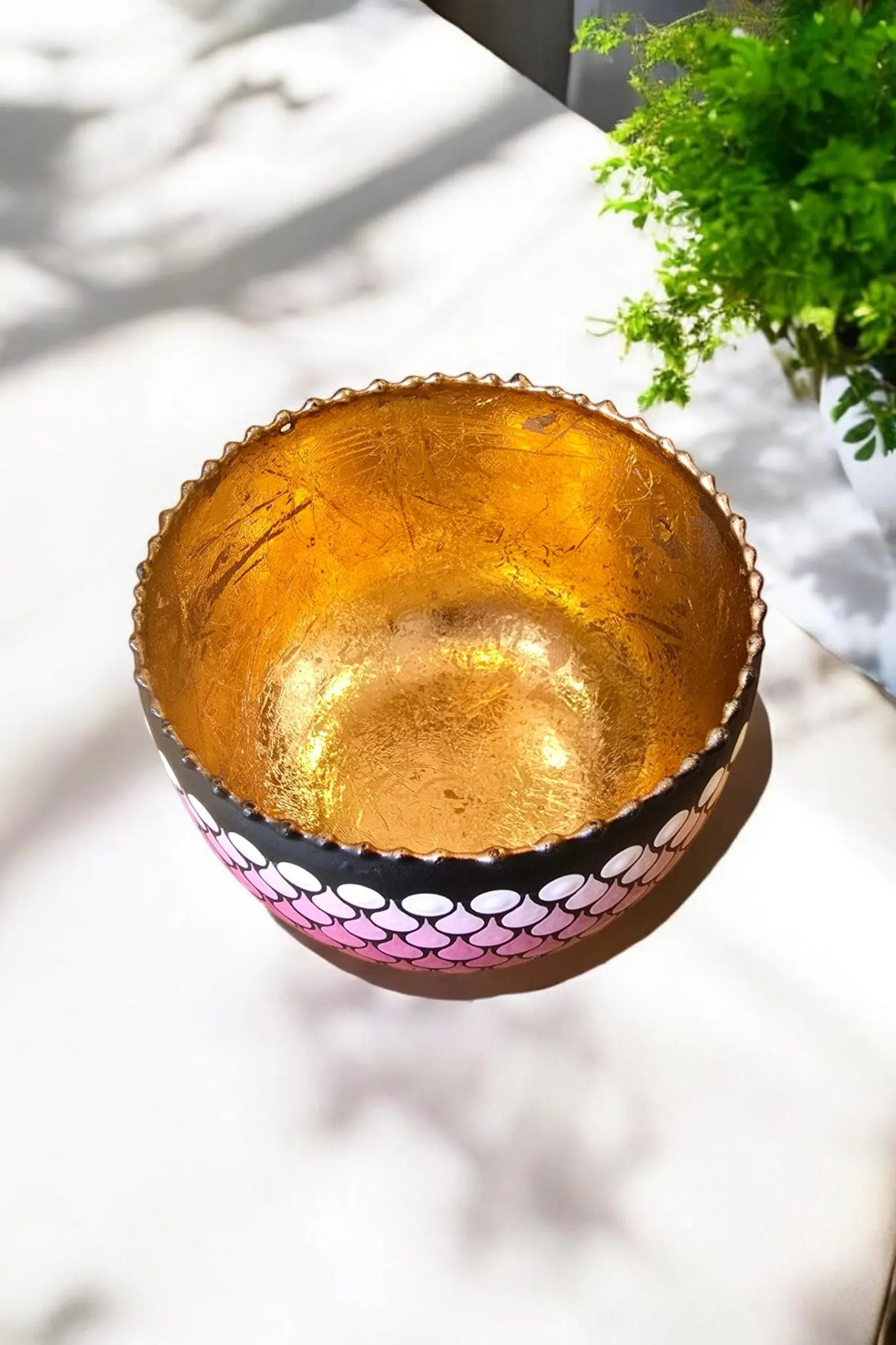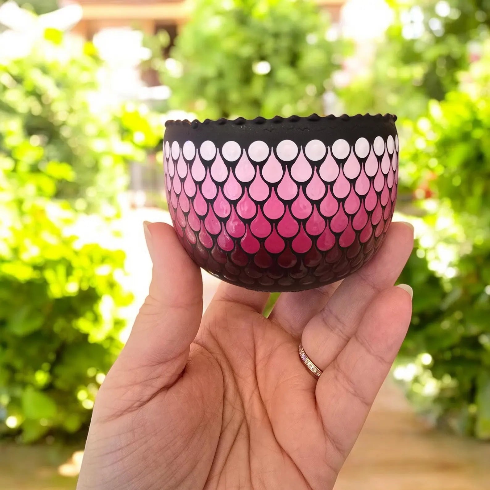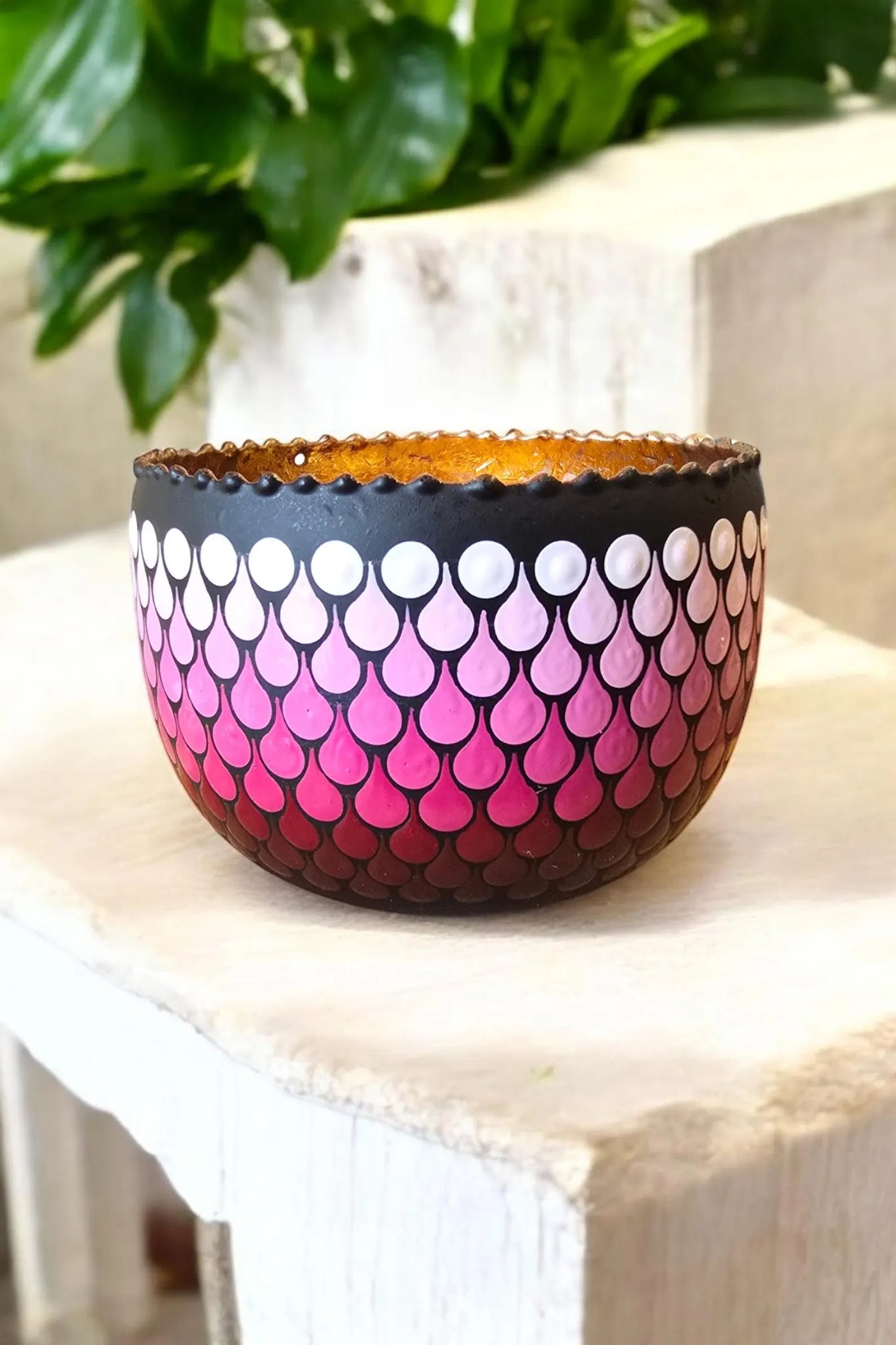 Bougeoir en métal peint à la main en pointillisme. Un dégradé de rose et de bordeaux éclatant pour une ambiance douce et lumineuse. Une création artisanale unique, idéale pour offrir ou sublimer votre intérieur.