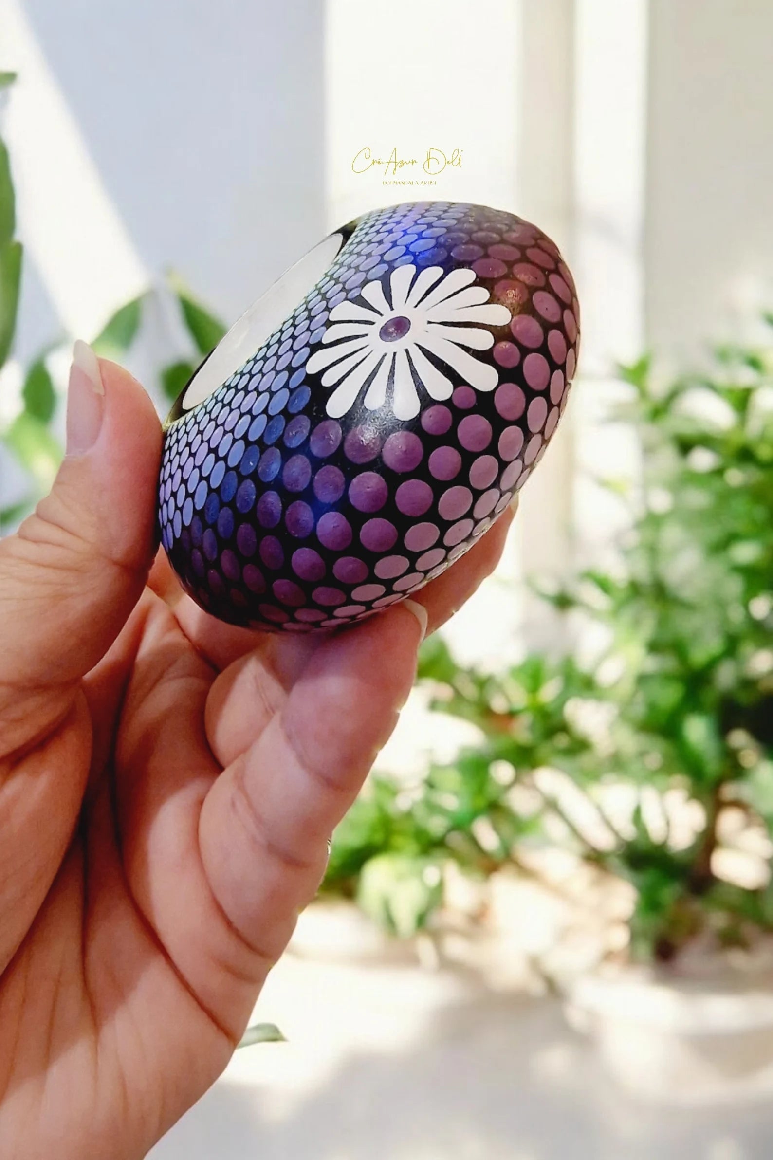 Ajoutez une touche artistique et chaleureuse à votre intérieur avec ce bougeoir en forme de galet, moulé en plâtre résine de haute qualité et minutieusement décoré à la main en dot painting/mandala.