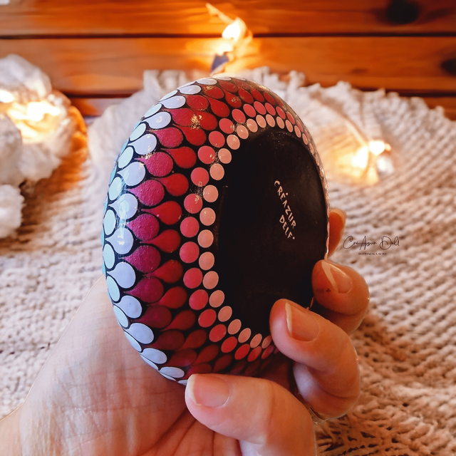 Chaque pièce est unique : peinte intuitivement selon la technique du dot painting (pointillisme) , elle présente de subtils dégradés de bleu, rose sur le dessus et de fuchsia métallisé sur une base noire élégante , pour un rendu visuel vibrant et harmonieux.