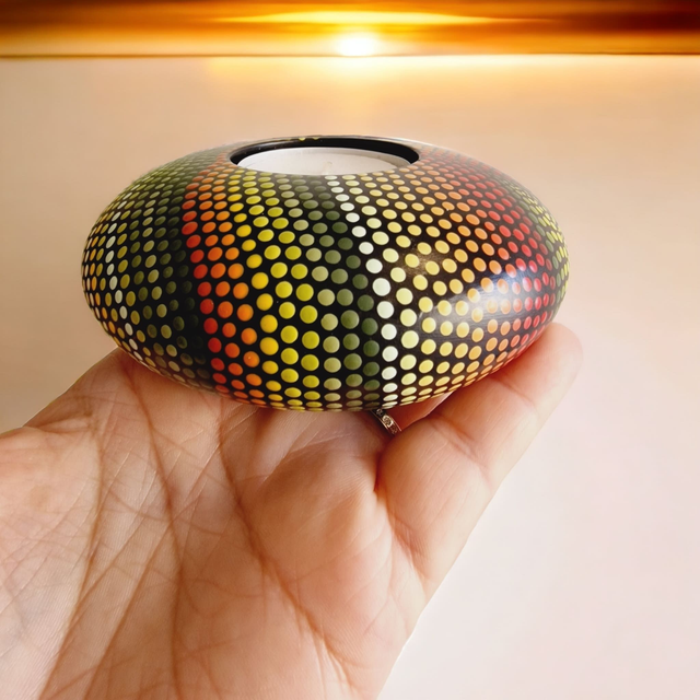 Chaque pièce est peinte à la main selon la technique du dot painting (pointillisme). Les dégradés de vert, orange, rouge et jaune contrastent harmonieusement avec la base noire, créant une œuvre vibrante et unique.