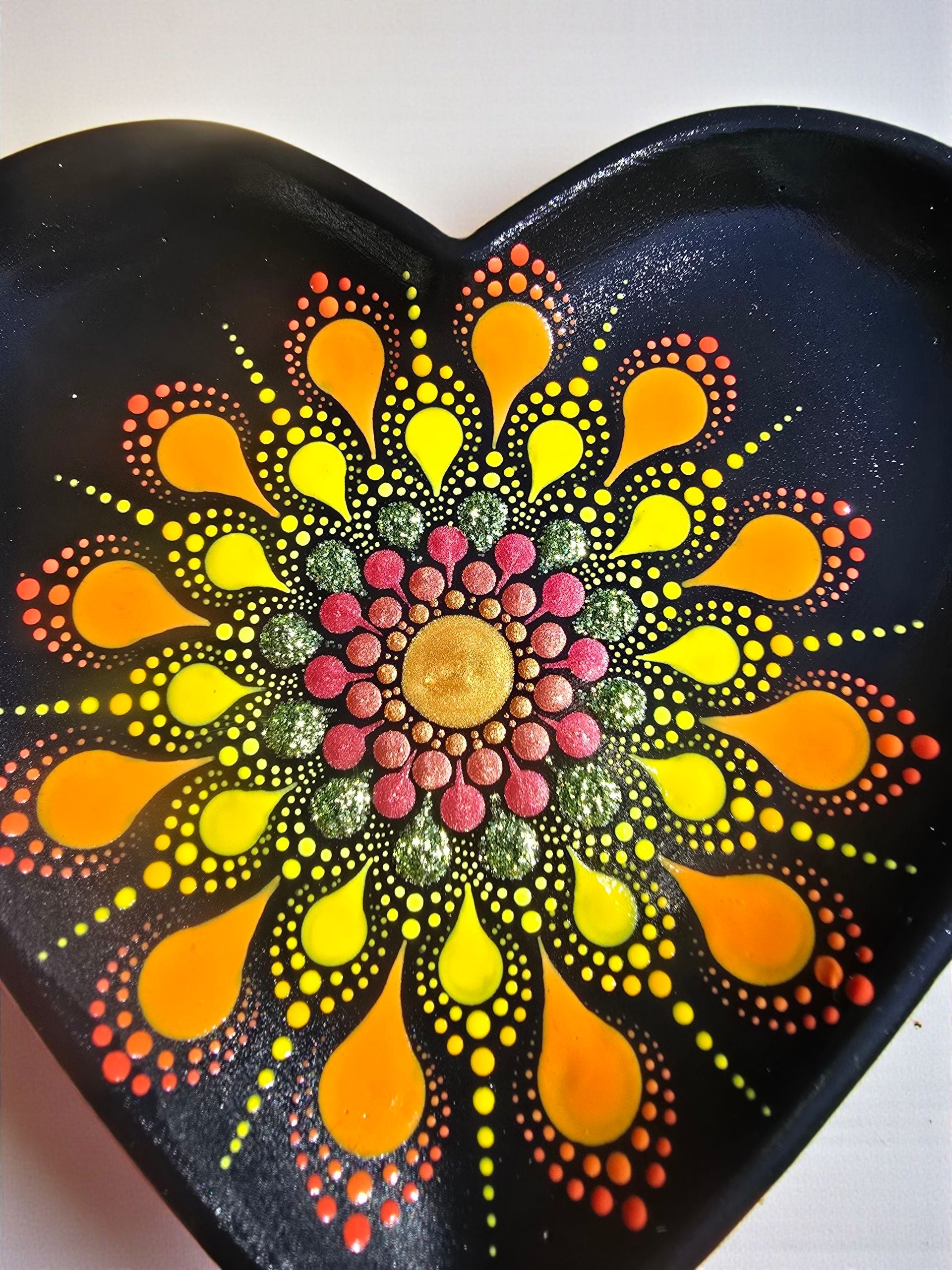 Coupelle cœur noire en plâtre personnalisé par un mandala jaune, orange, fuchsia, vert pailleté & doré en pointillisme fait main.