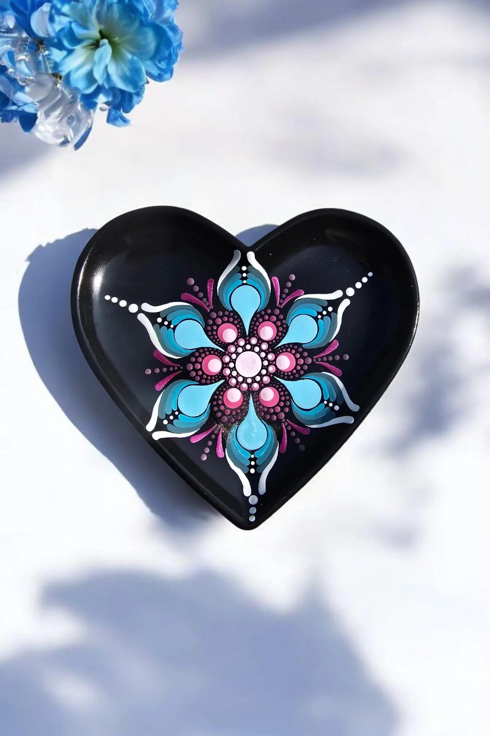 Apportez une touche d'élégance artisanale à votre intérieur avec cette coupelle en forme de cœur, moulée à la main en plâtre résine de haute qualité. Elle est décorée d’un mandala en pointillisme bleu et fuchsia, soigneusement peint à la main sur une base noire, puis vernie pour un fini brillant et durable.