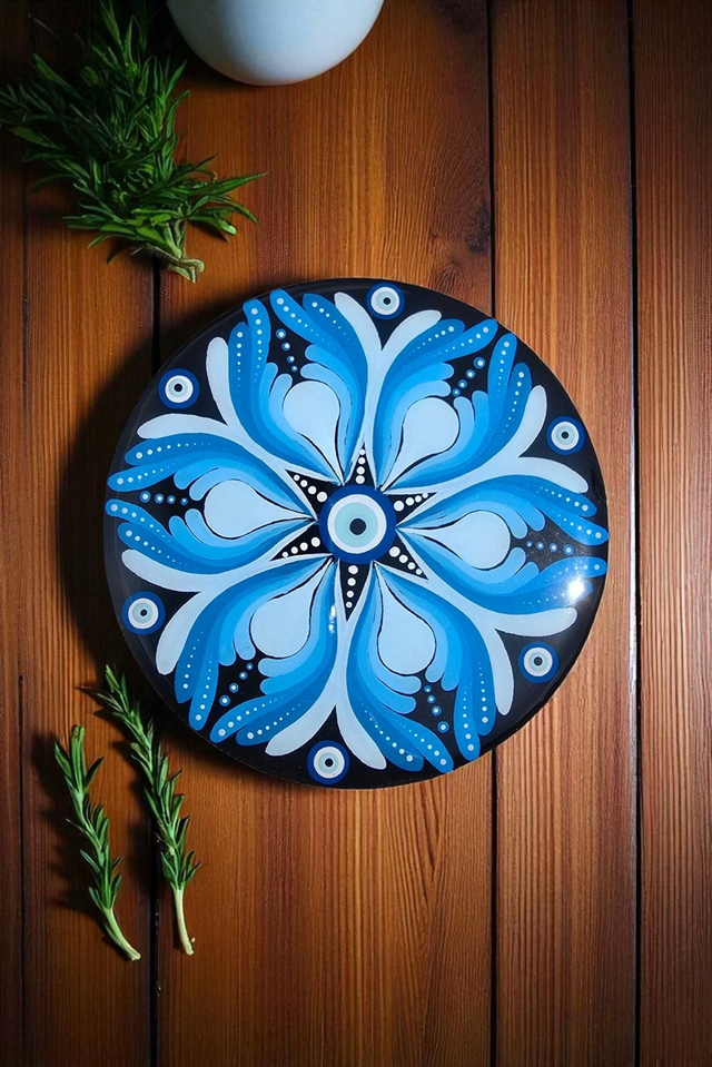 Dessous de verre mandala oeil de protection peint à la main en dégradés de bleu et blanc selon la technique du dot painting (pointillisme).