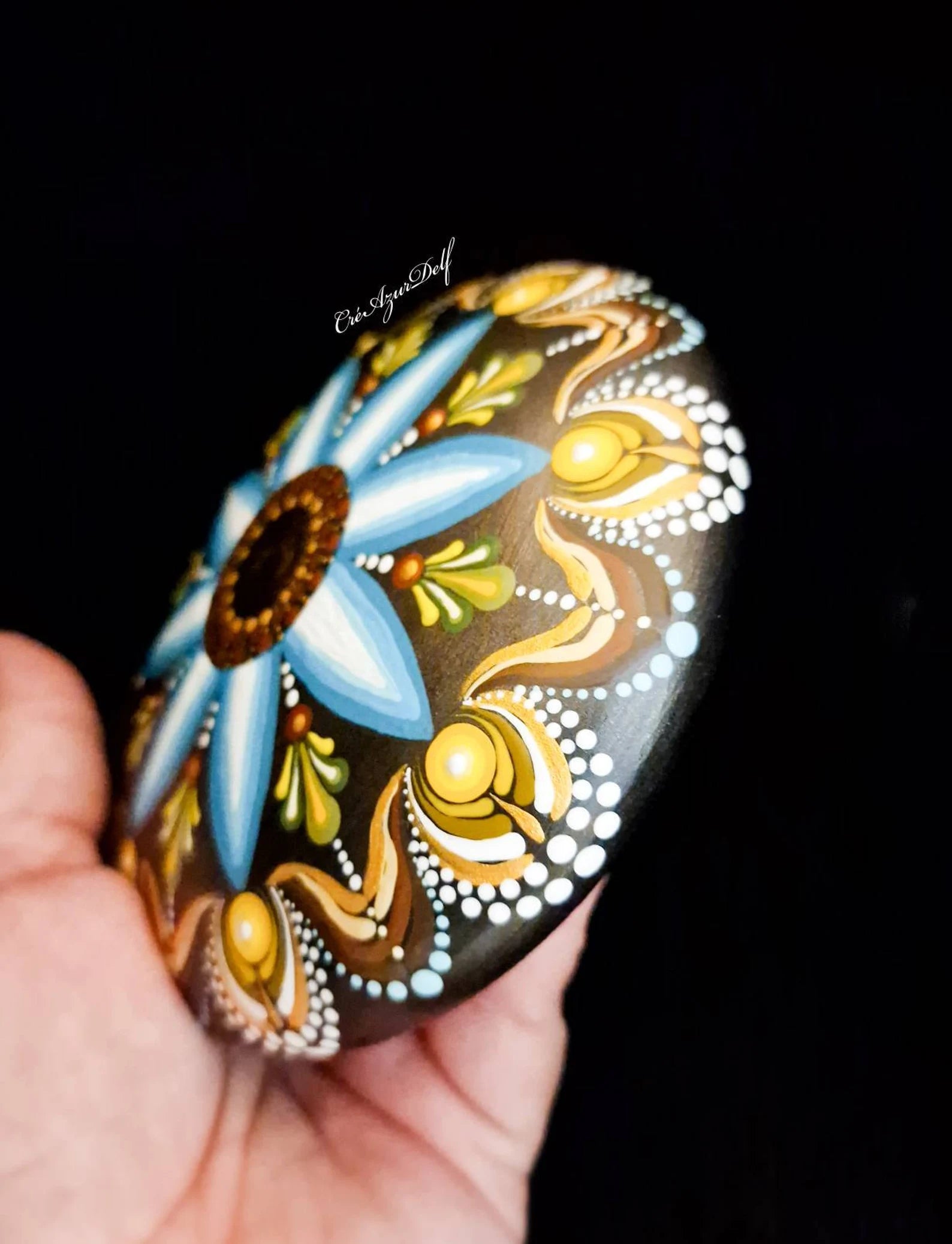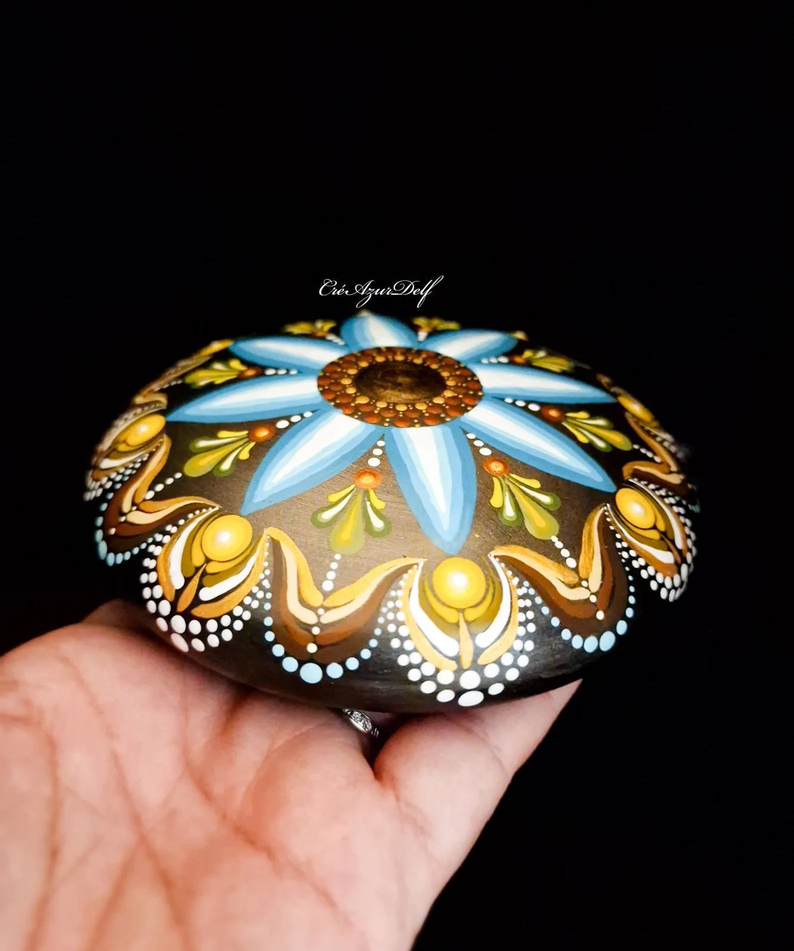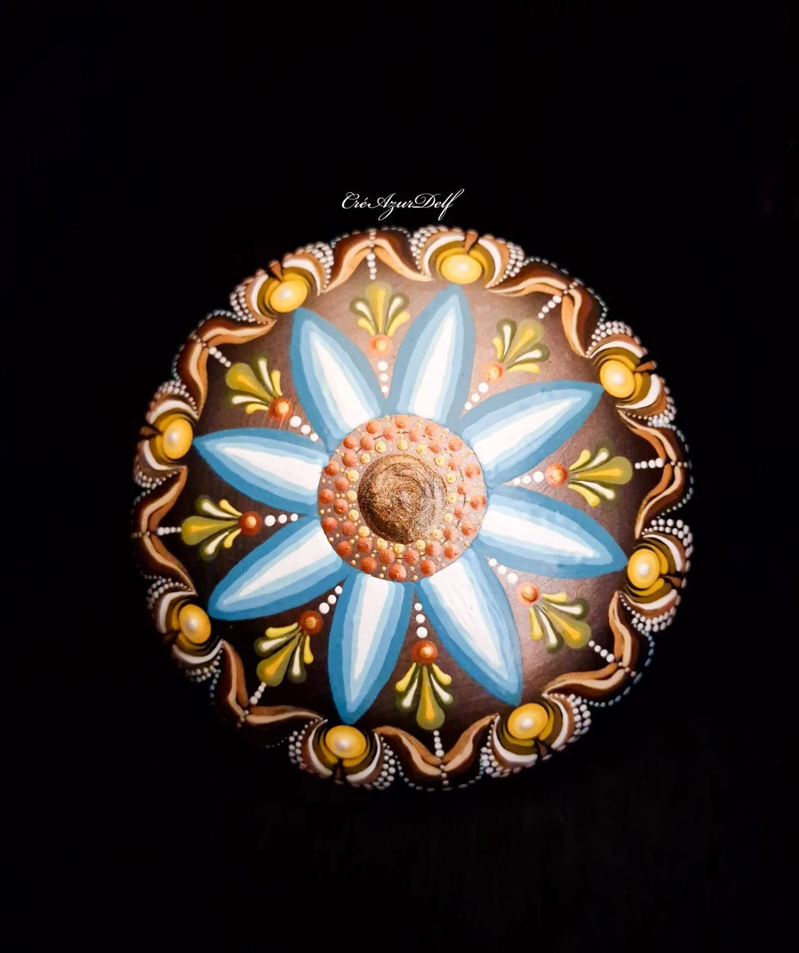 Sublimez votre intérieur avec cette grande pierre mandala moulée en plâtre résine de haute qualité, puis peinte à la main selon la technique du dot painting/pointillisme. La base bronze & noir est rehaussée de motifs floraux bleus, or et blancs, puis scellée par un vernis brillant pour protéger les couleurs et assurer une belle tenue dans le temps.