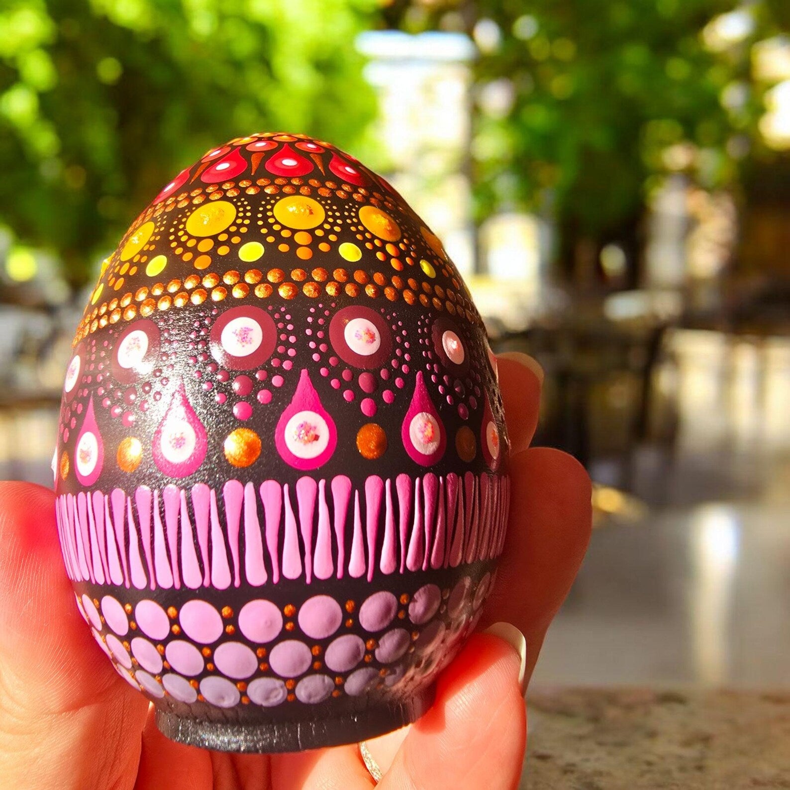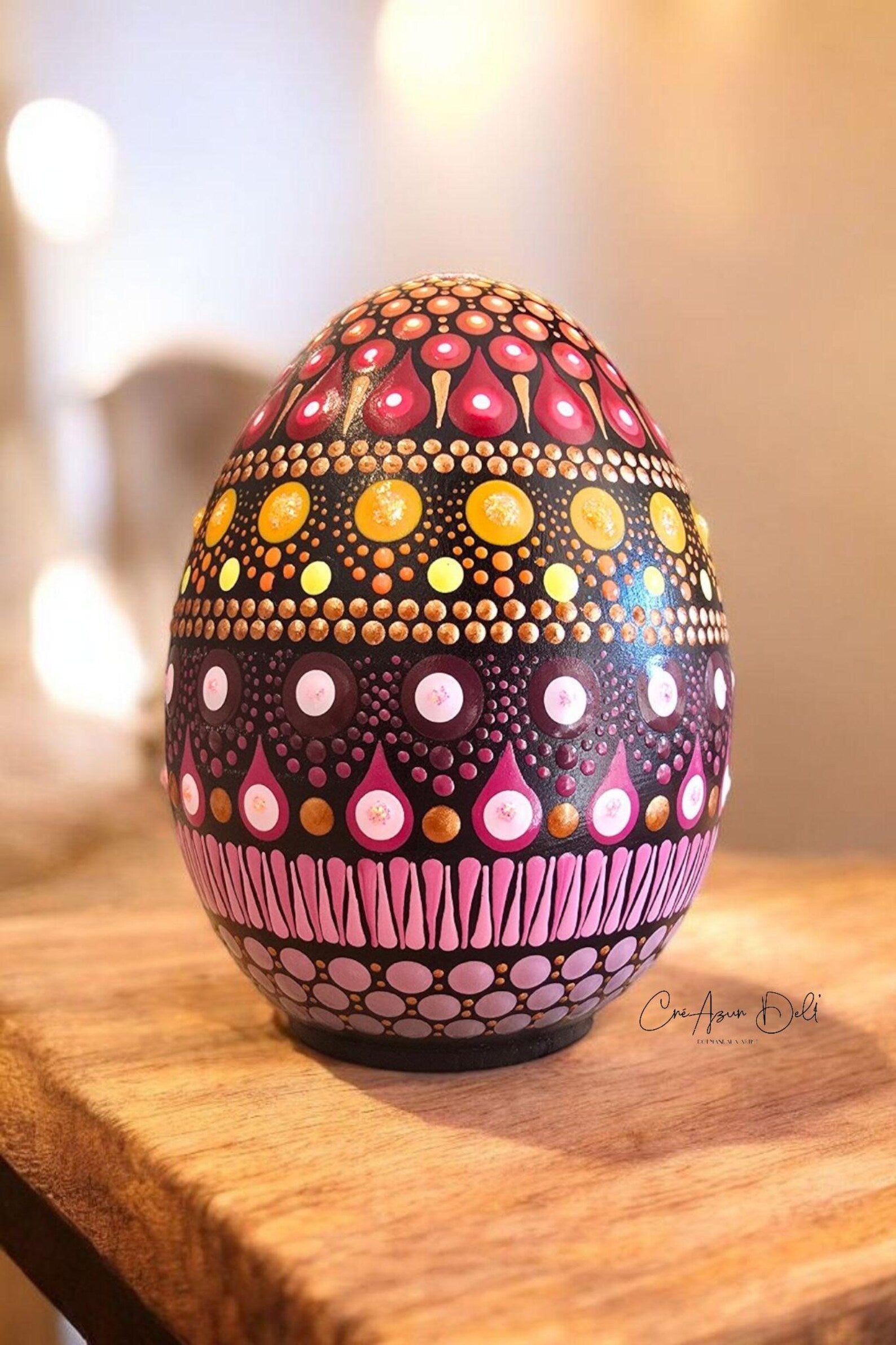Ajoutez une touche d’originalité et de couleur à votre intérieur avec cet œuf décoratif artisanal en plâtre résine de haute qualité, entièrement peint à la main selon la technique du pointillisme.