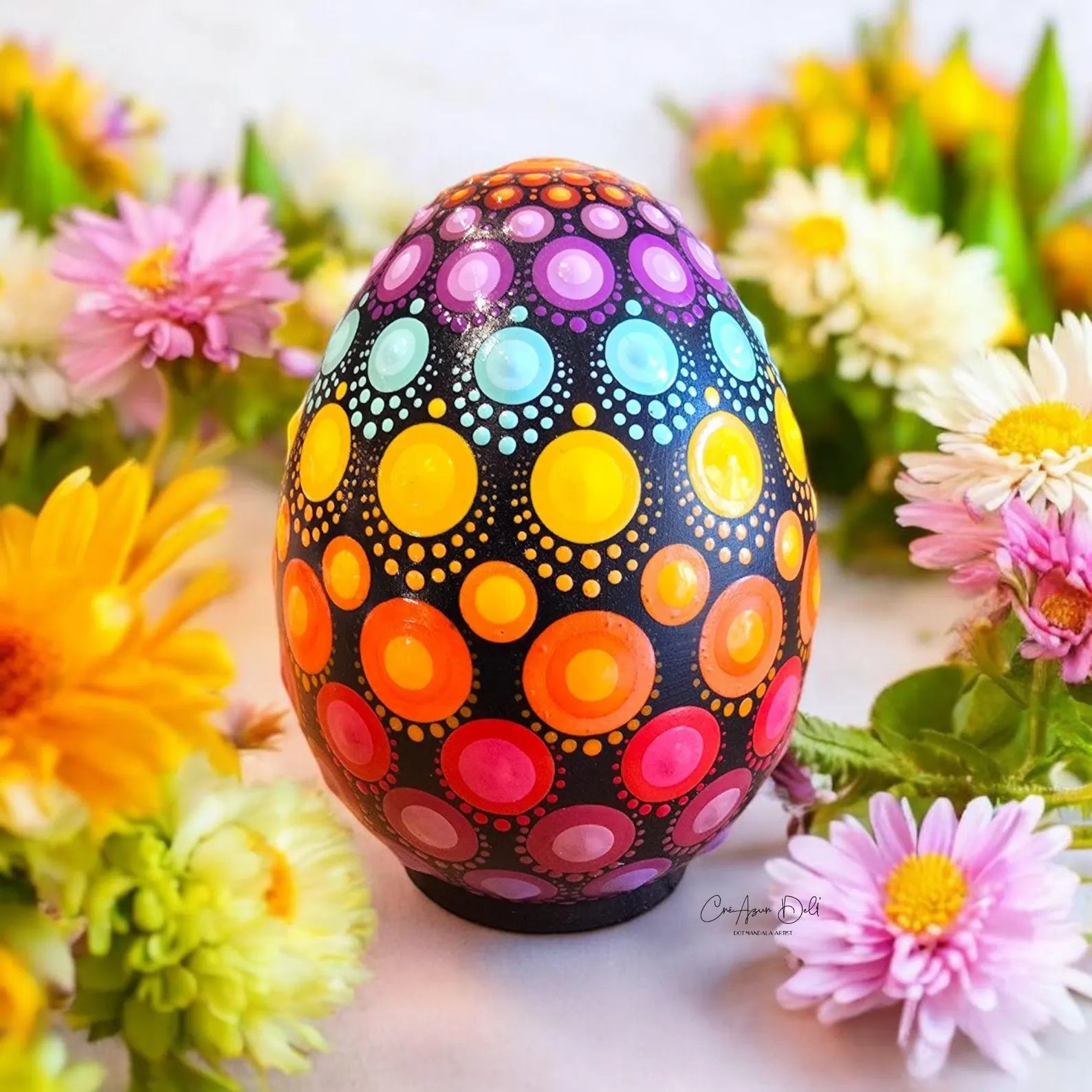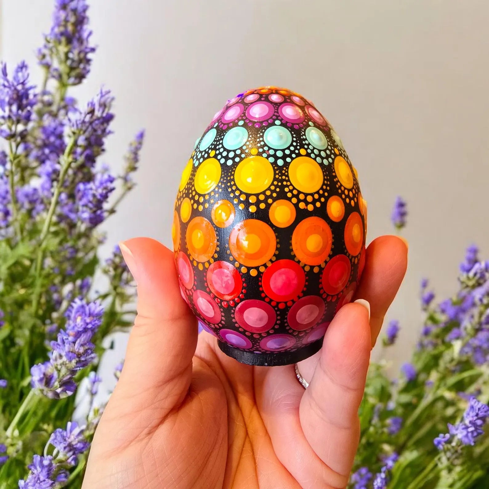 Œuf décoratif en plâtre résine– Peint à la main en dot painting multicolore