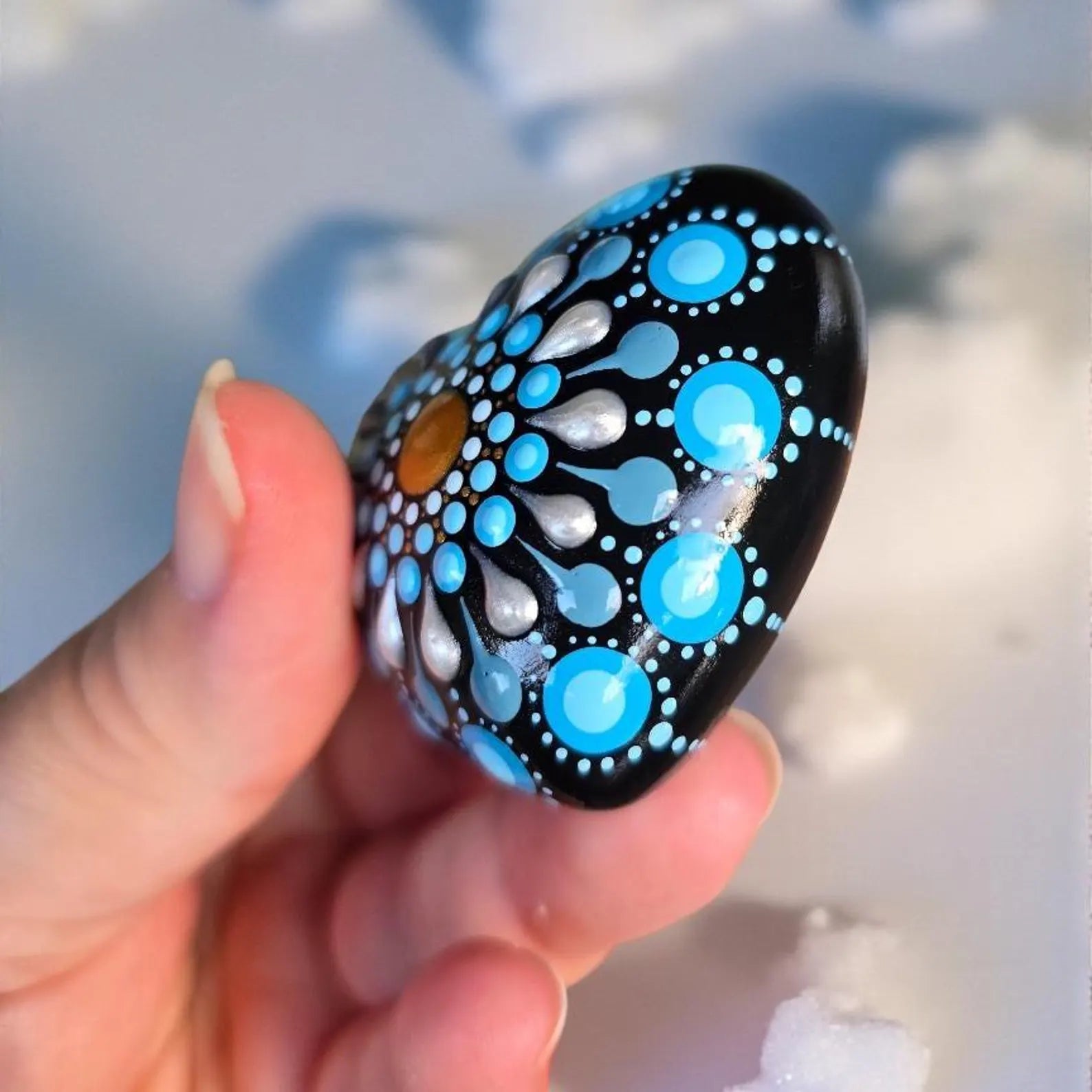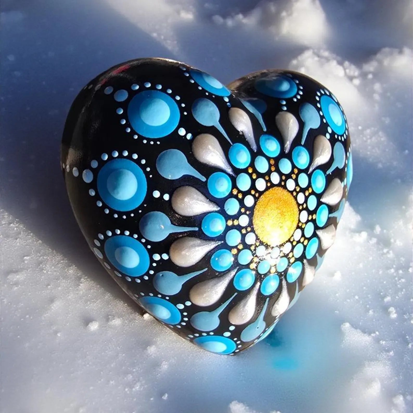 Petit Cœur Mandala Pointillisme Bleu Doré Blanc Nacré – Pierre Méditation Fait Main