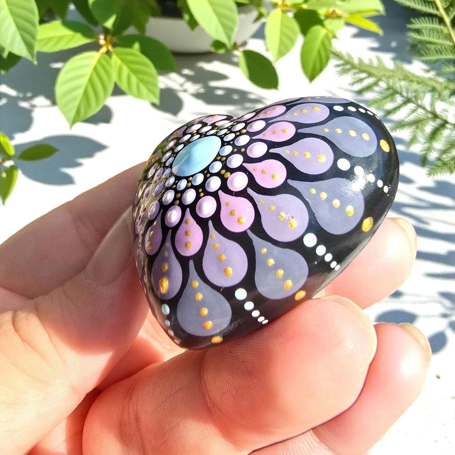 Petite pierre en forme de coeur mandala peinte à la main, réalisée en plâtre résine de haute qualité.