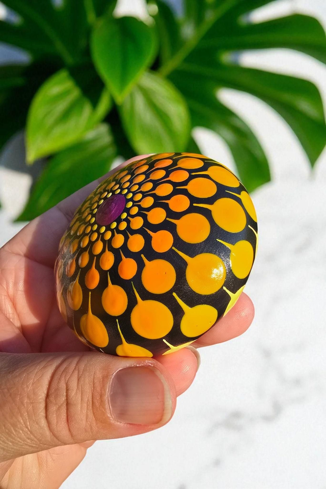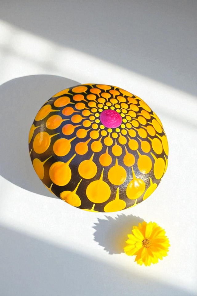 Elle a été peinte à la main avec de la peinture acrylique fuchsia metallisé orange et jaune sur une base noire en mandala pointillisme.