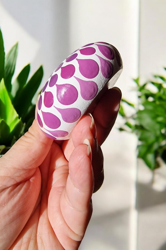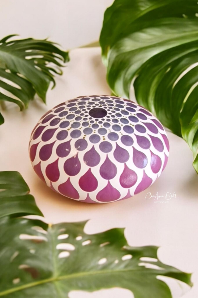Elle a été peinte à la main avec de la peinture acrylique violine nacrée sur une base blanche en mandala pointillisme.