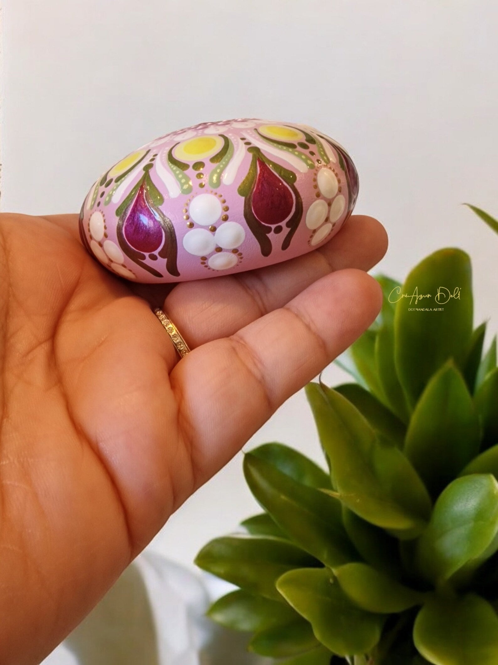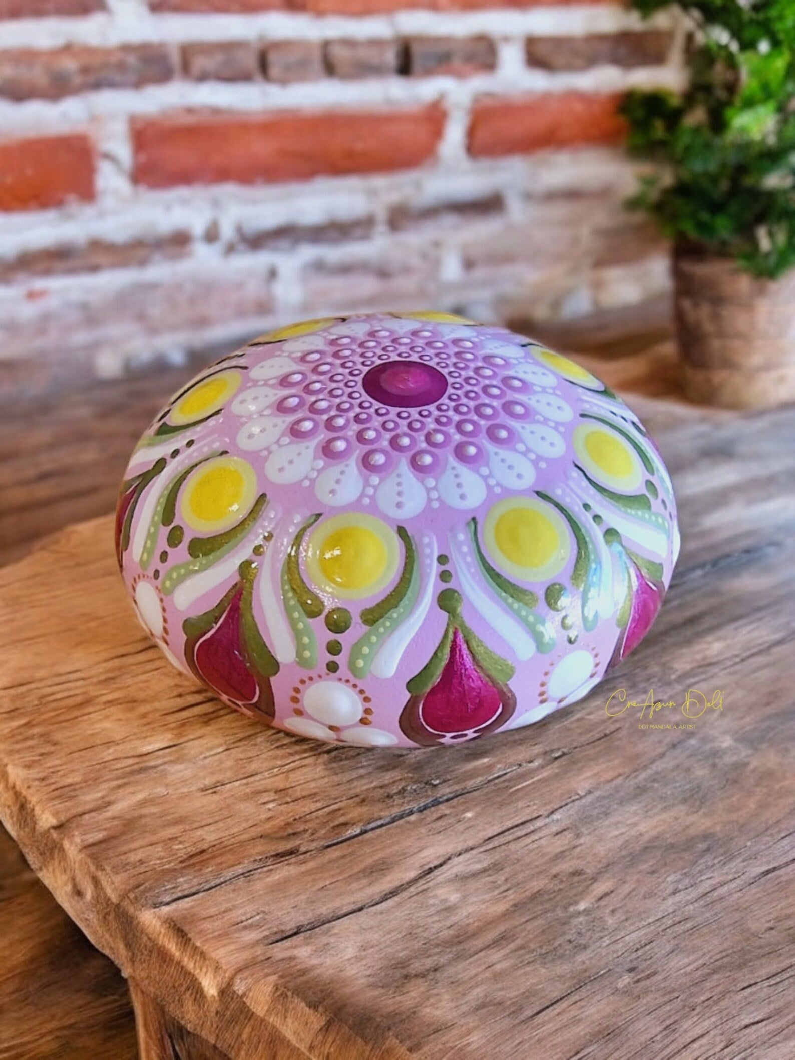 Petite pierre mandala en pointillisme fuchsia métallisé et vert