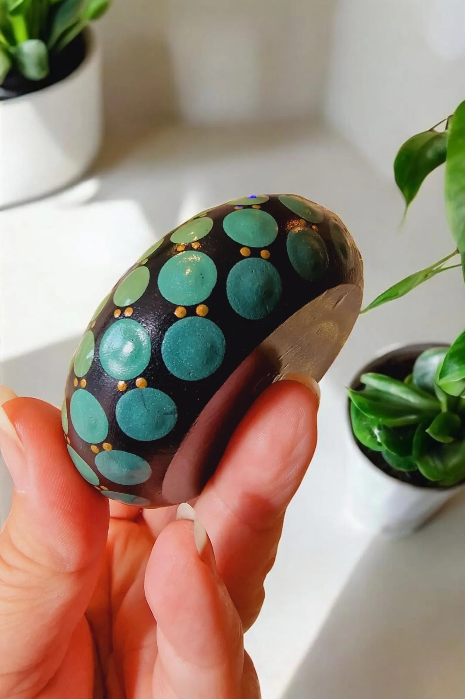 La pierre est très agréable au touché dû aux reliefs des points de peinture.