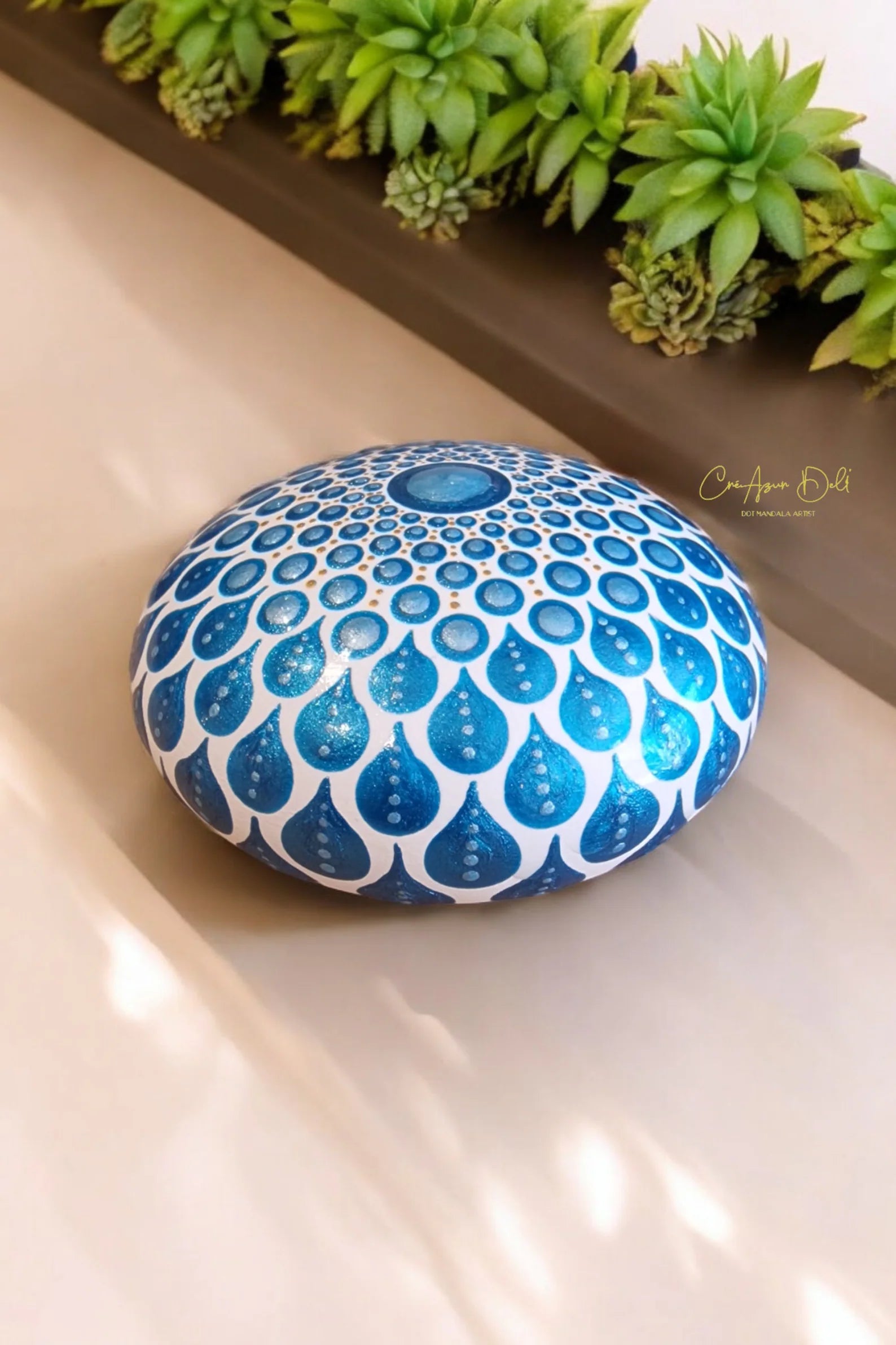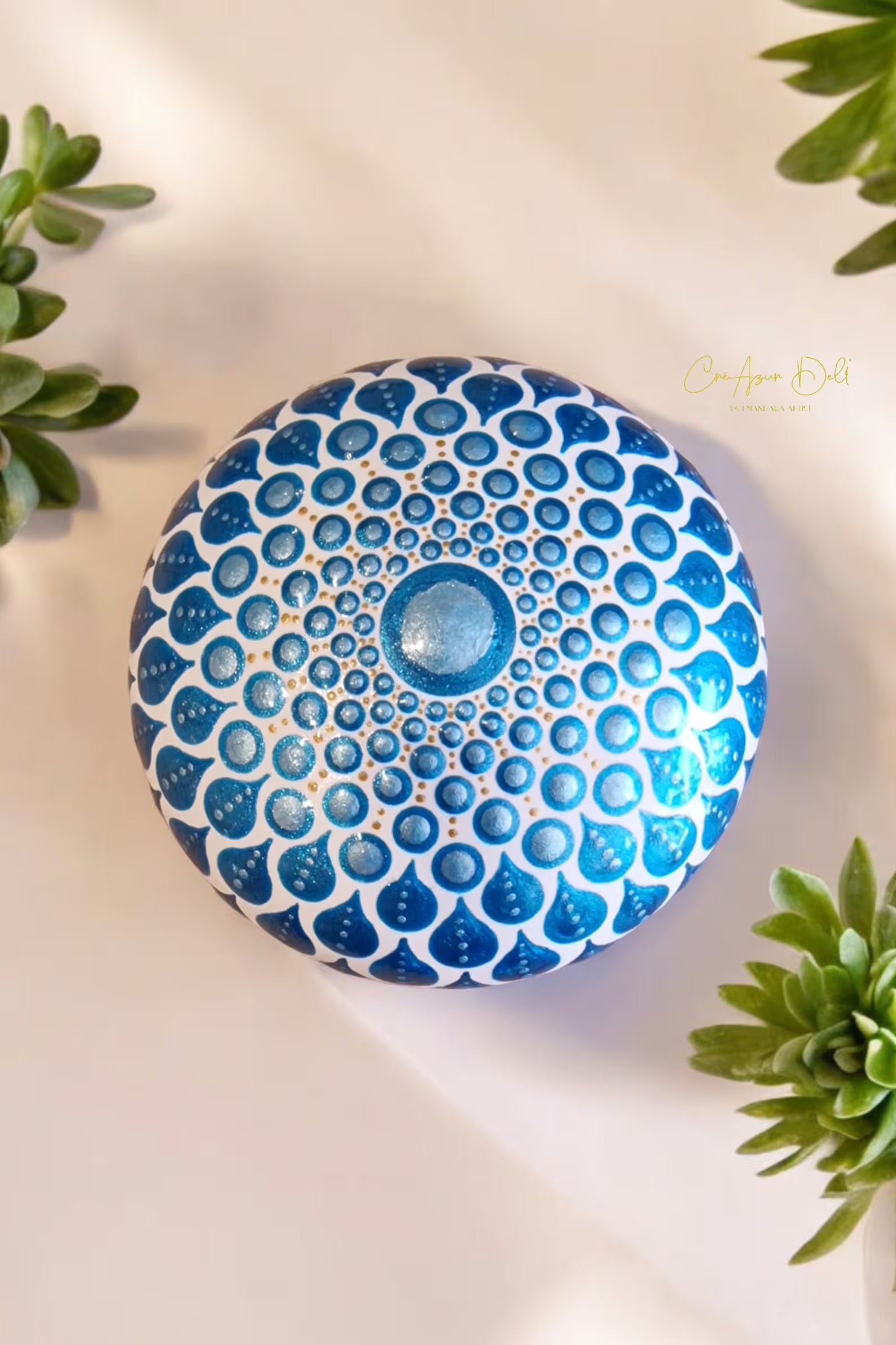 🎨 Peinte à la main selon la technique du dot painting (pointillisme), elle présente de subtils de bleu métallisé et blanc sur une base blanche , avec un vernis protecteur brillant qui lui confère éclat et durabilité.