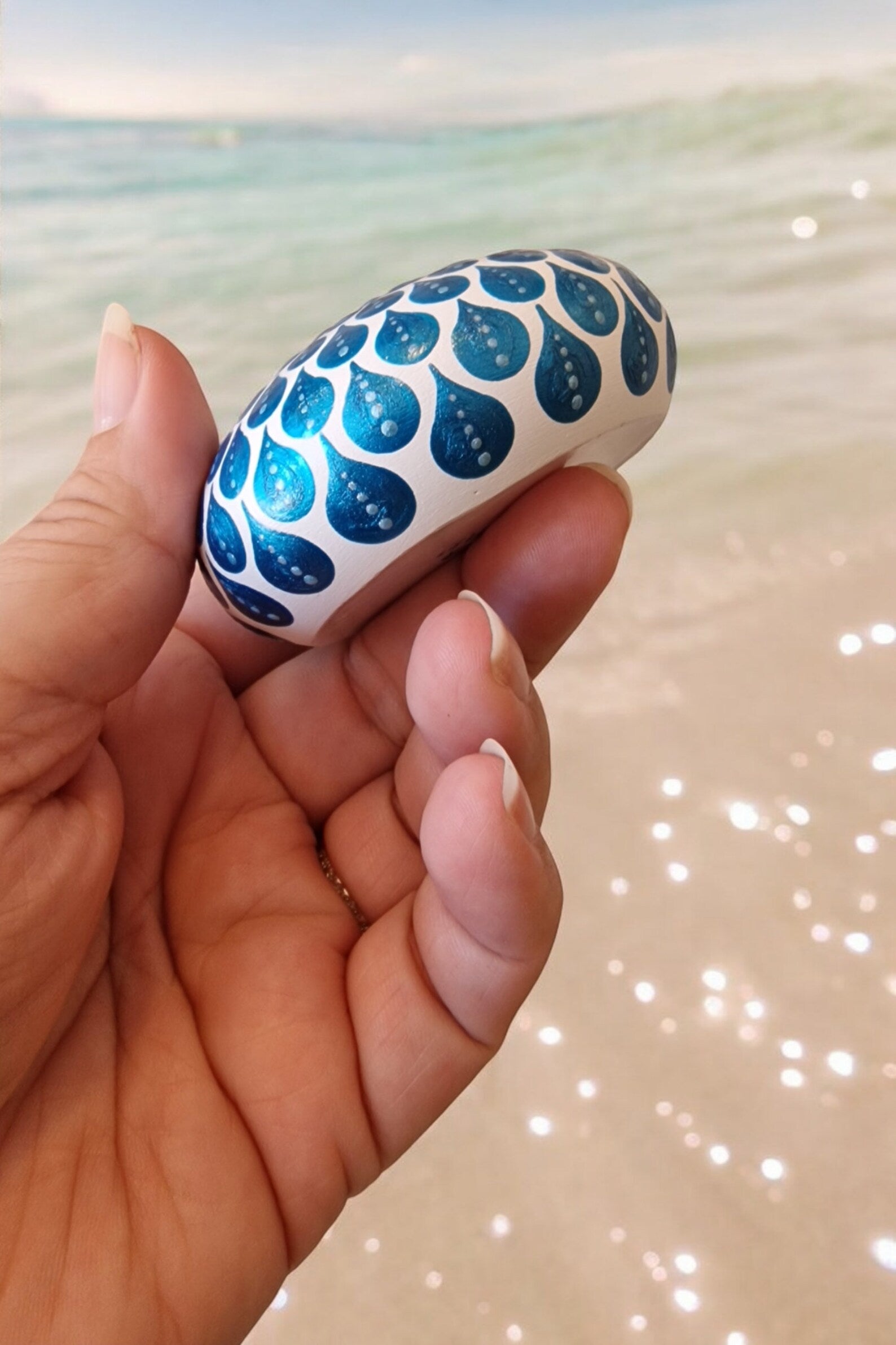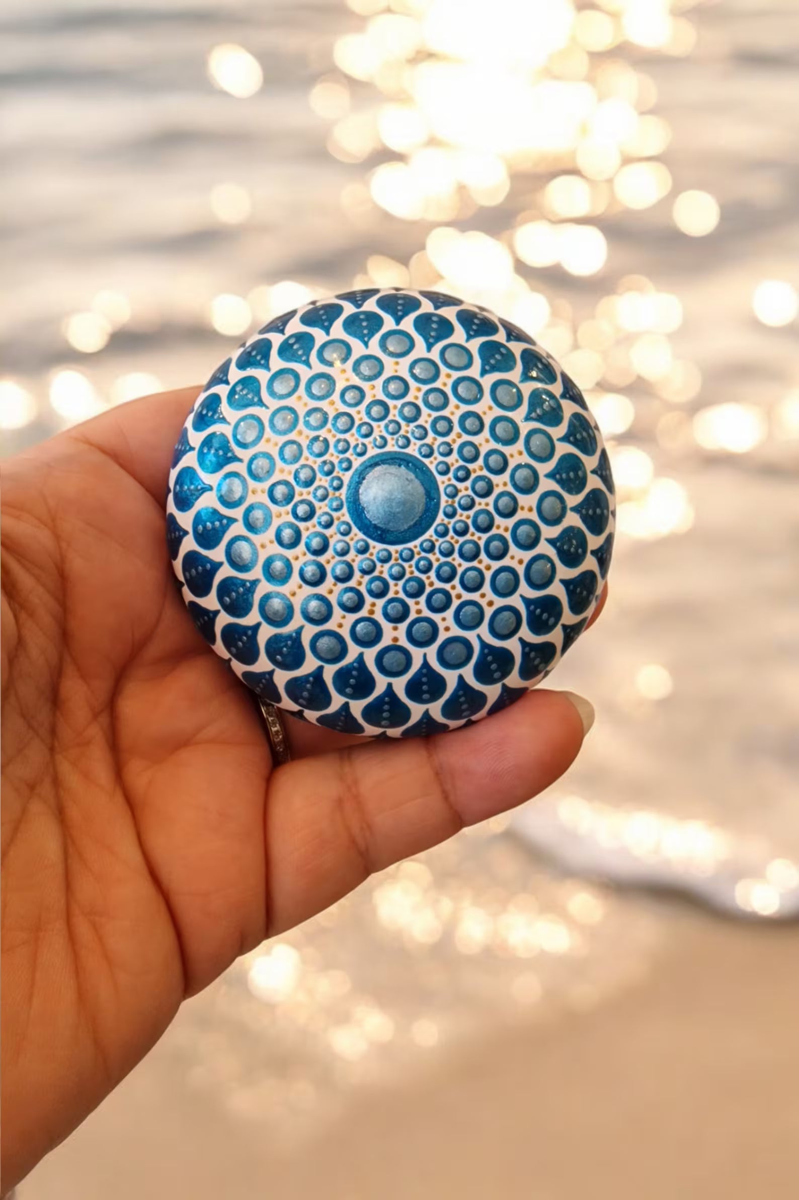 Pierre de méditation peinte à la main – Dégradés bleu métallisé & blanc