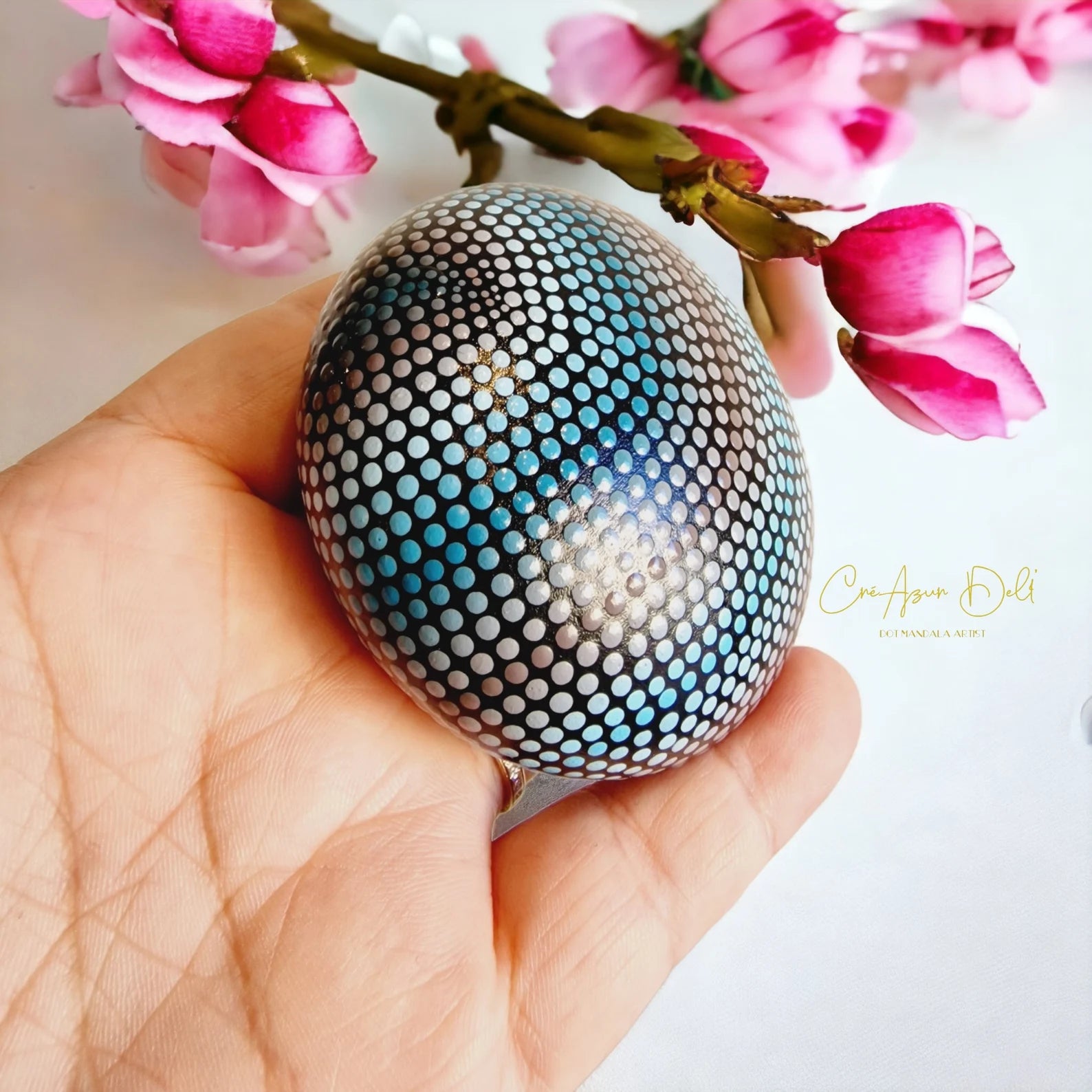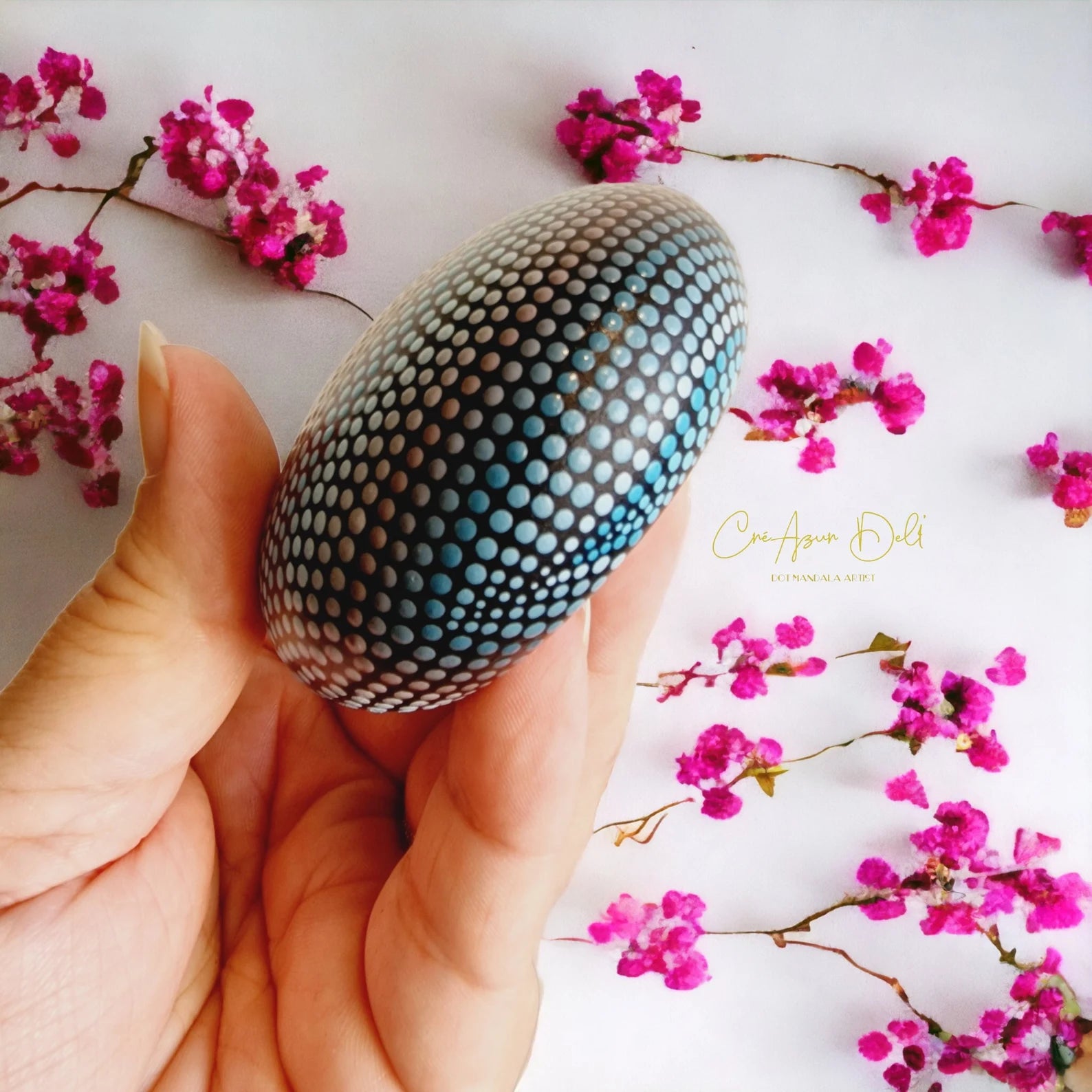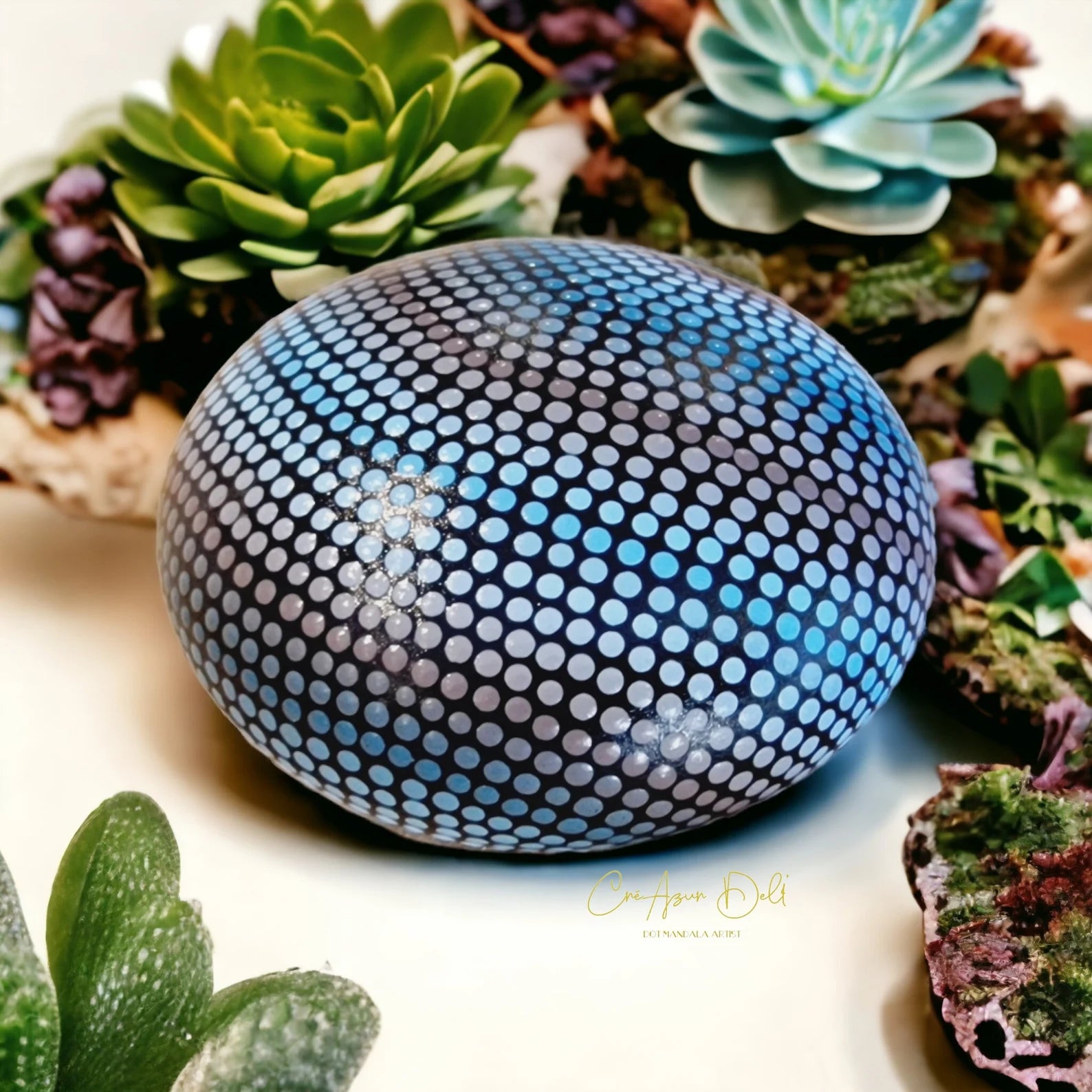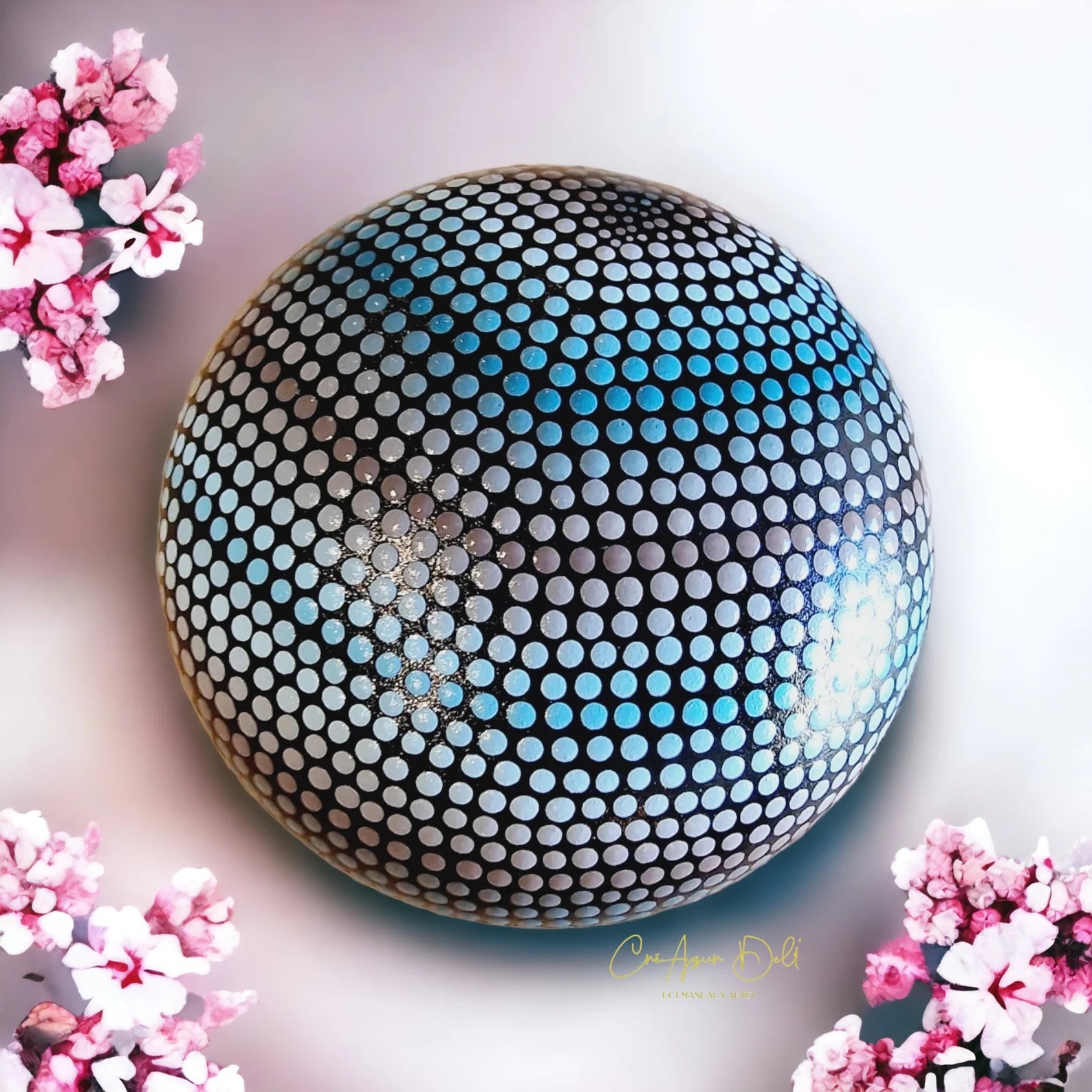 🎨 Peinte à la main selon la technique du dot painting (pointillisme), elle présente de subtils dégradés de bleu et de violacé, avec un vernis protecteur brillant qui lui confère éclat et durabilité.