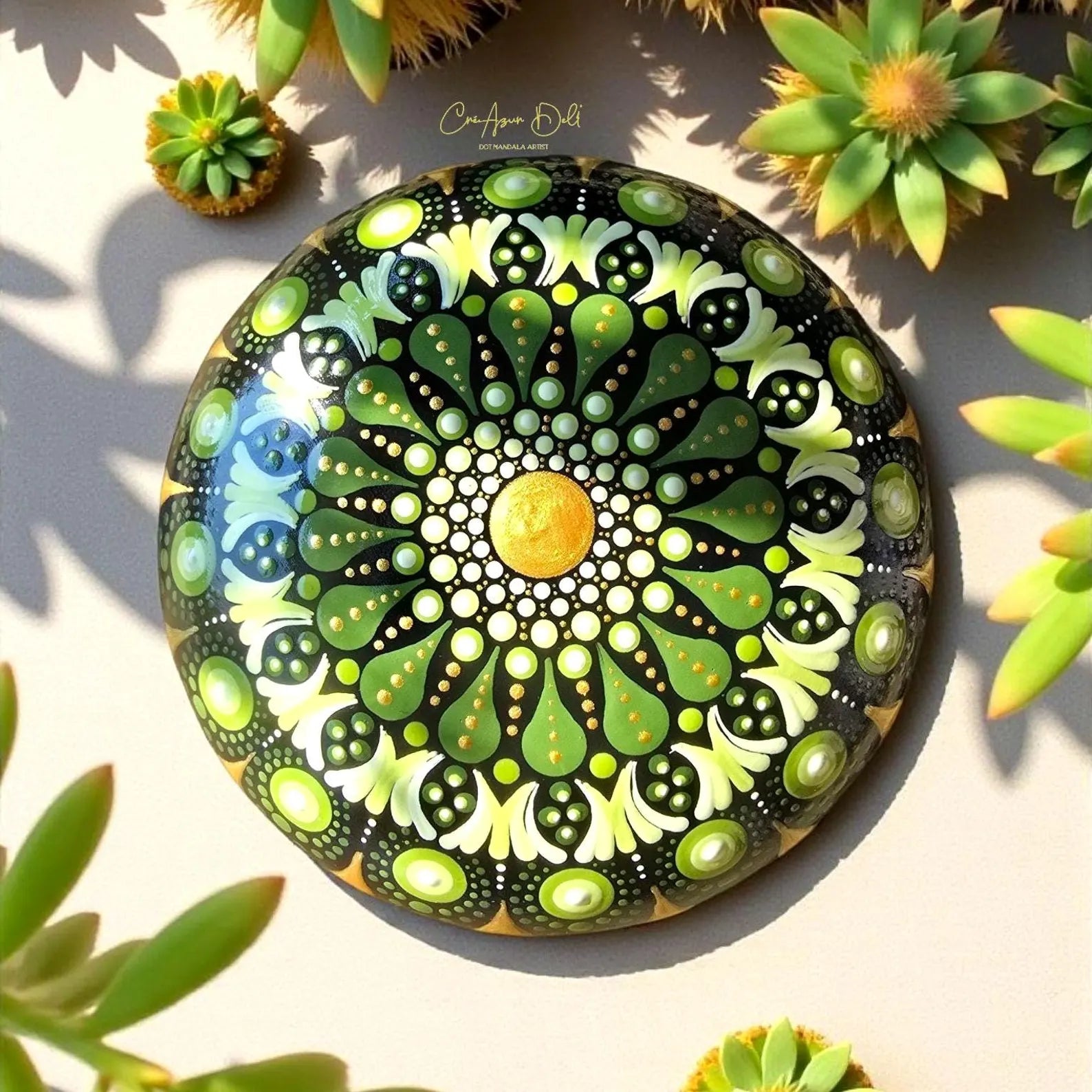 Cette pierre de méditation unique moulée en plâtre résine est entièrement peinte à la main avec des motifs mandala délicats en dégradés de vert et rehaussés de touches dorées. Symbole d’harmonie et d’équilibre, elle est idéale pour accompagner vos moments de méditation, de relaxation ou simplement pour décorer votre espace sacré.