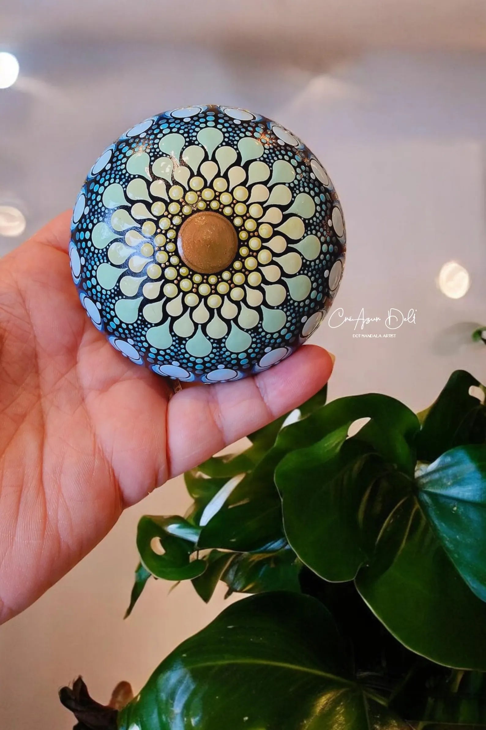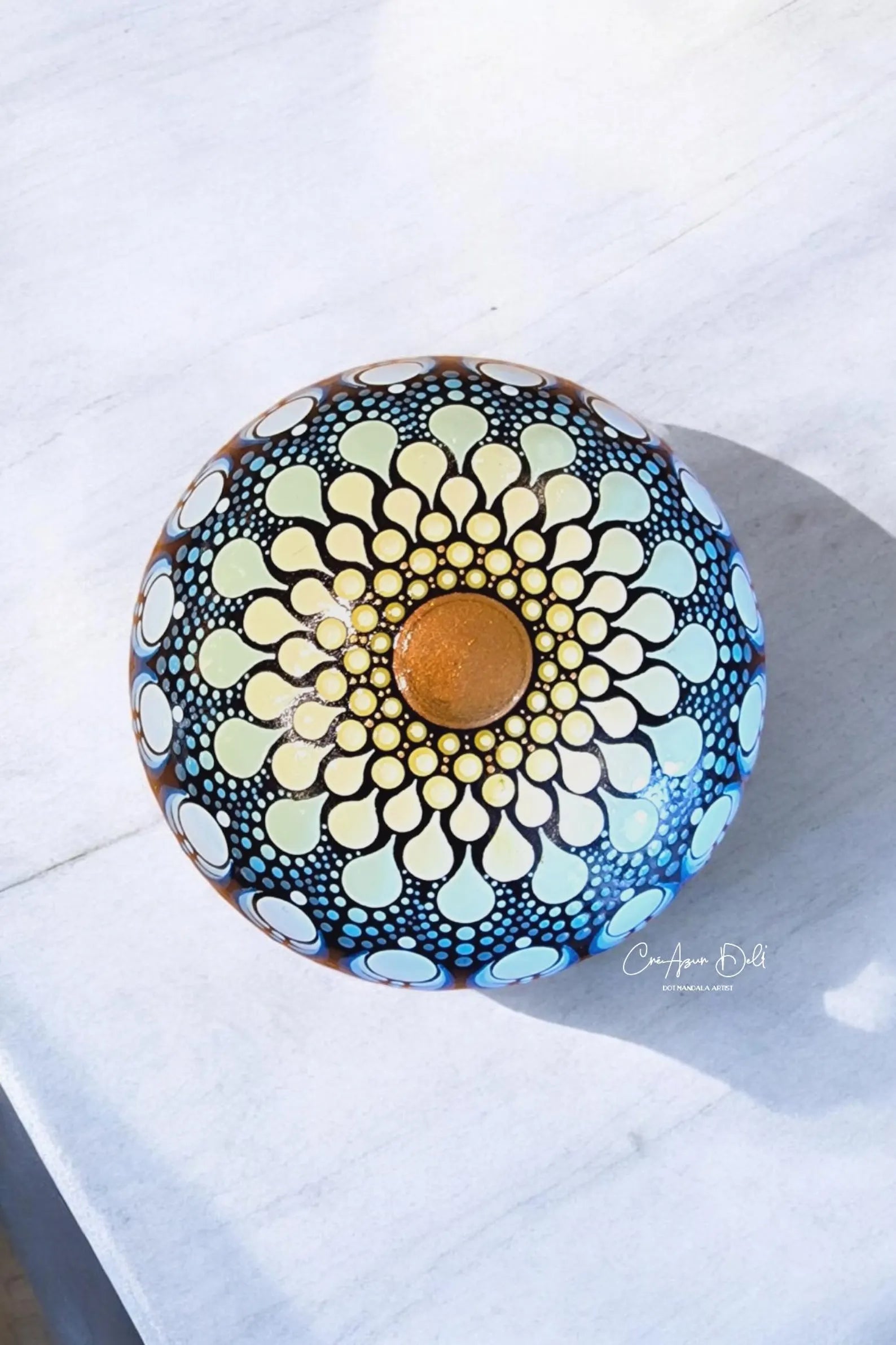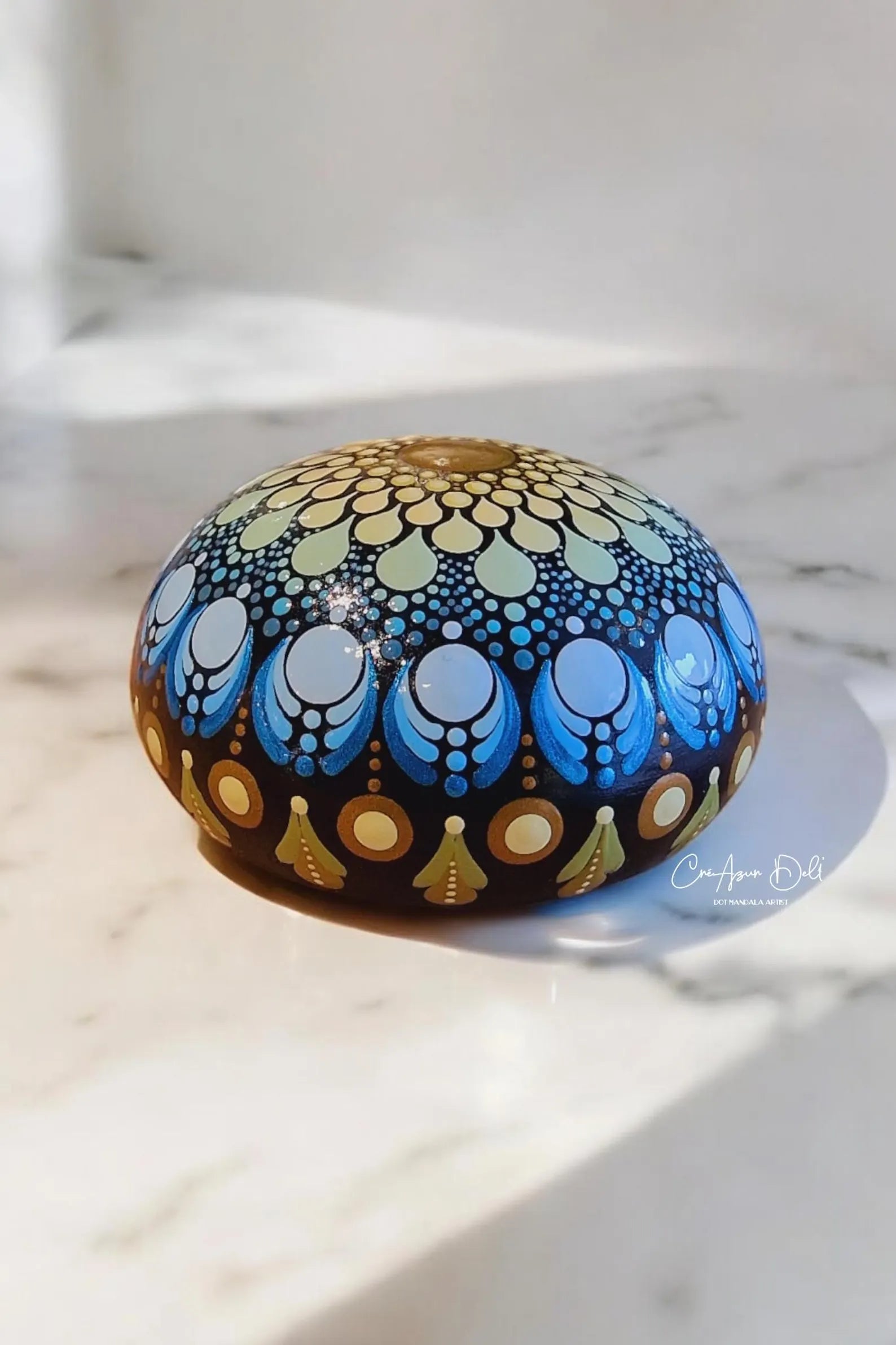 Apportez une touche unique et apaisante à votre intérieur avec cette pierre mandala en forme de dôme, réalisée en plâtre résine de haute qualité et minutieusement peinte à la main selon la technique du pointillisme.
