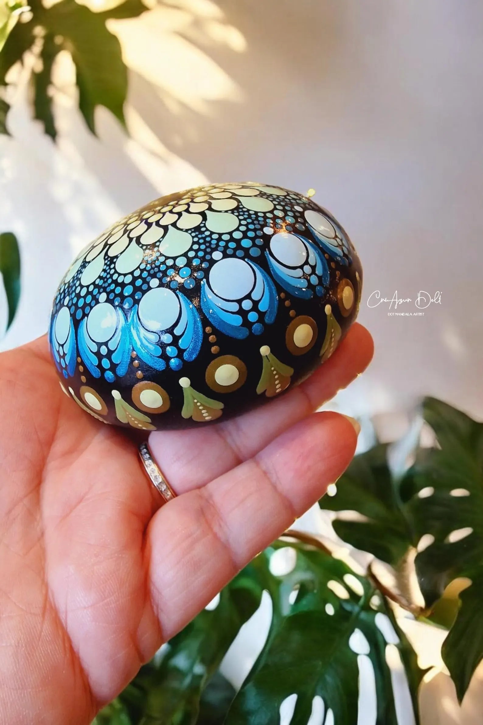 Chaque pierre est unique et peinte intuitivement, reflétant un état d’apaisement lors de sa création. C’est une pièce artisanale idéale pour offrir en cadeau ou pour enrichir votre collection d’objets décoratifs.