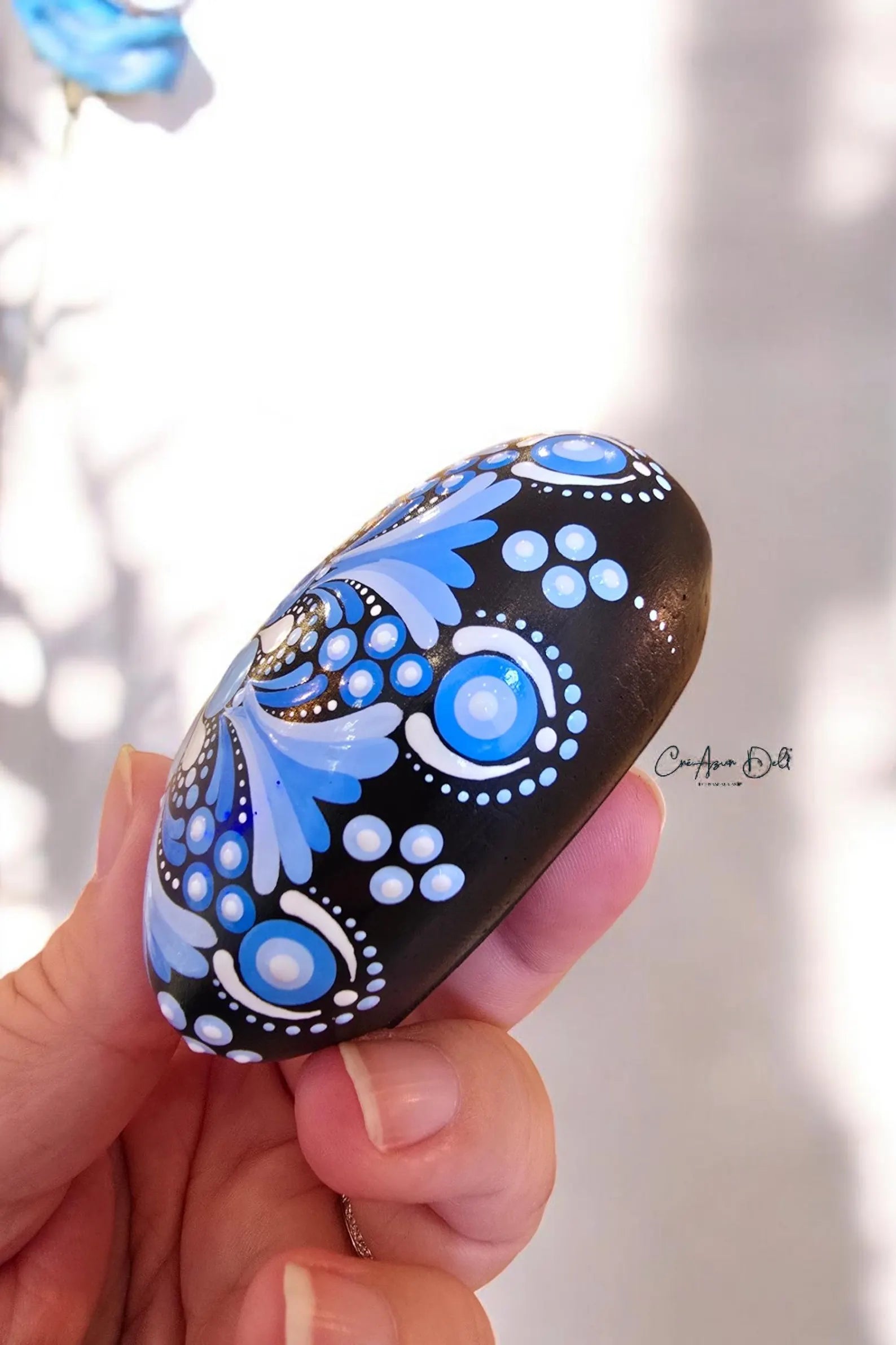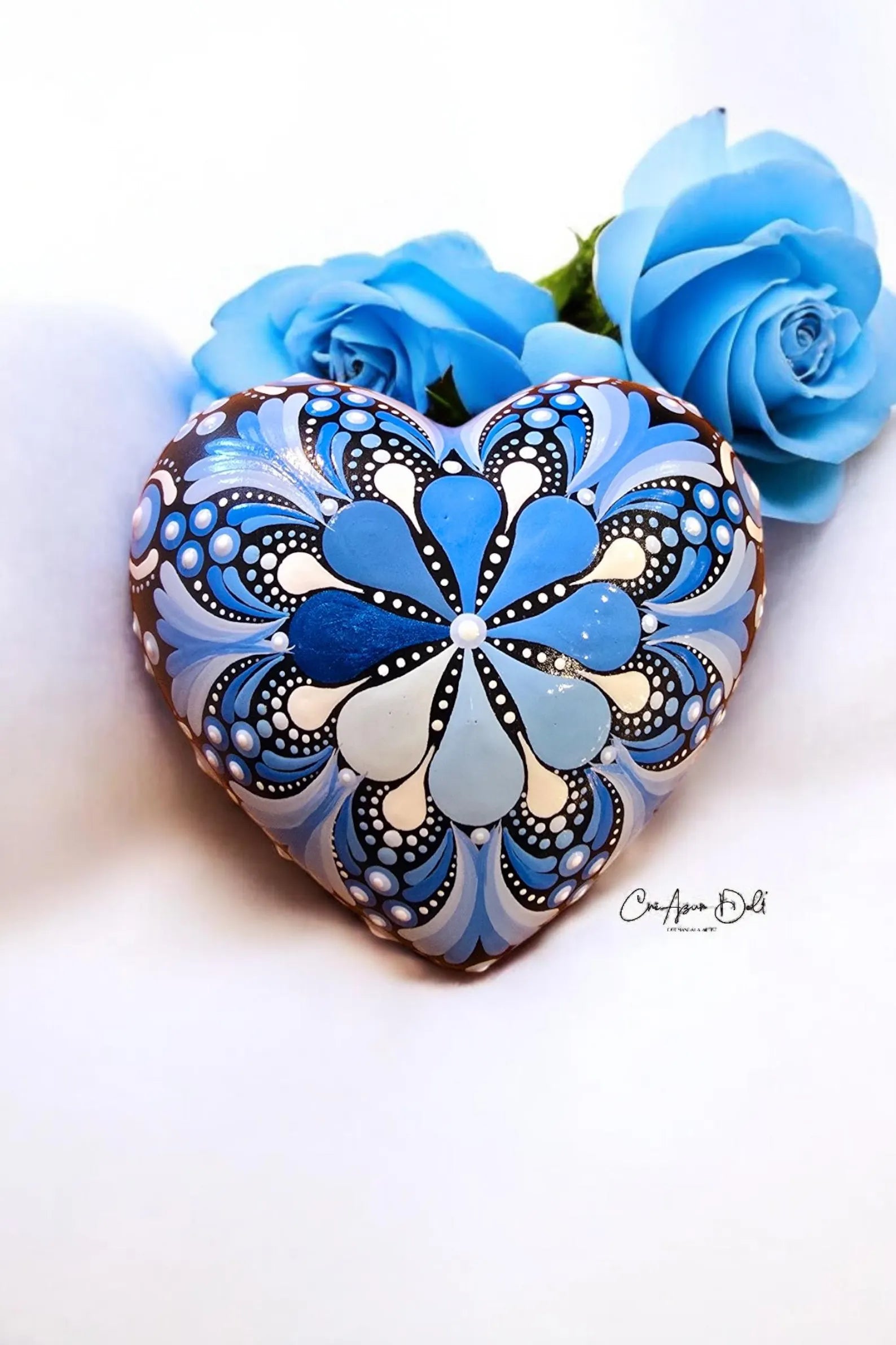 Pierre mandala en forme de cœur bleu et blanc – Cadeau unique, méditation & décoration
