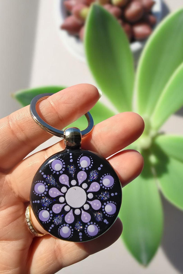 Porte-clés mandala peint double face mauve et pailleté