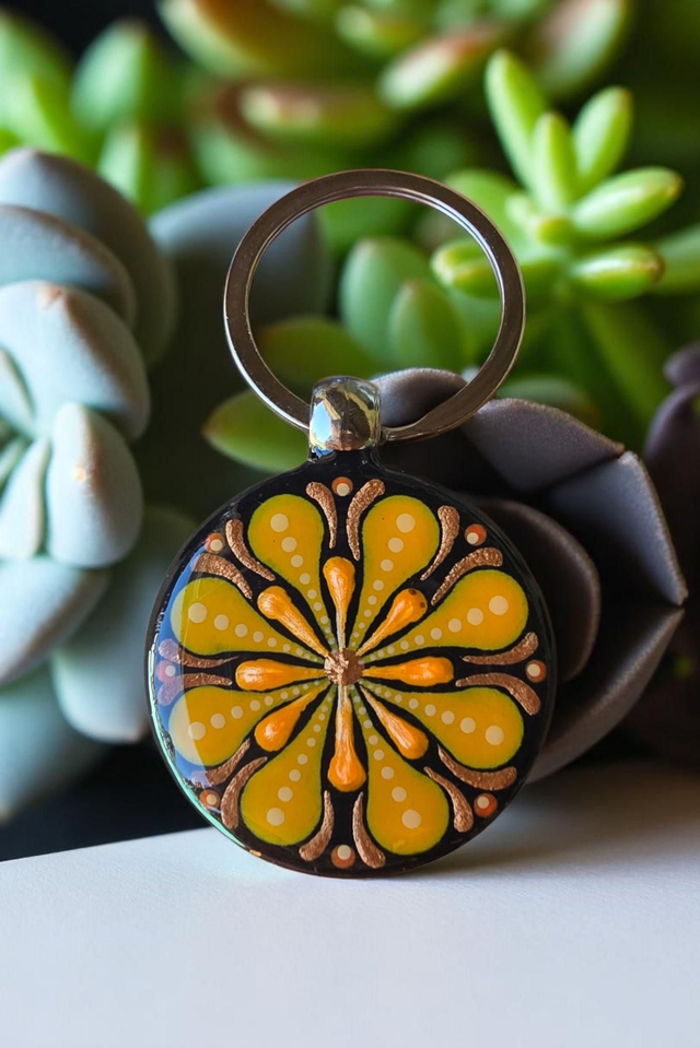 Ajoutez une touche artistique et spirituelle à votre quotidien avec ce porte-clés en bois peint à la main, orné de mandalas sur les deux faces.