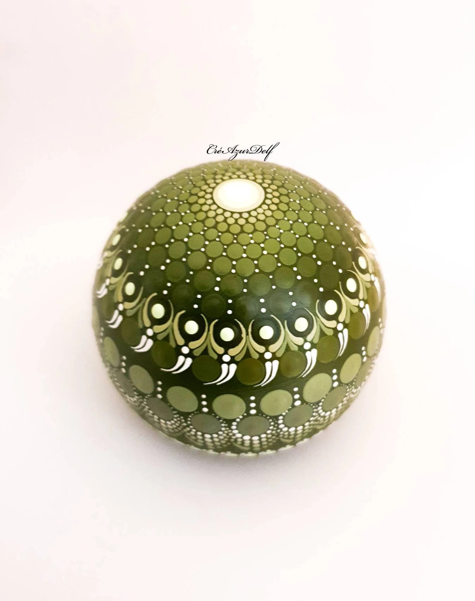 Sphère décorative en plâtre résine peinte à la main – Pointillisme vert et blanc sur fond noir