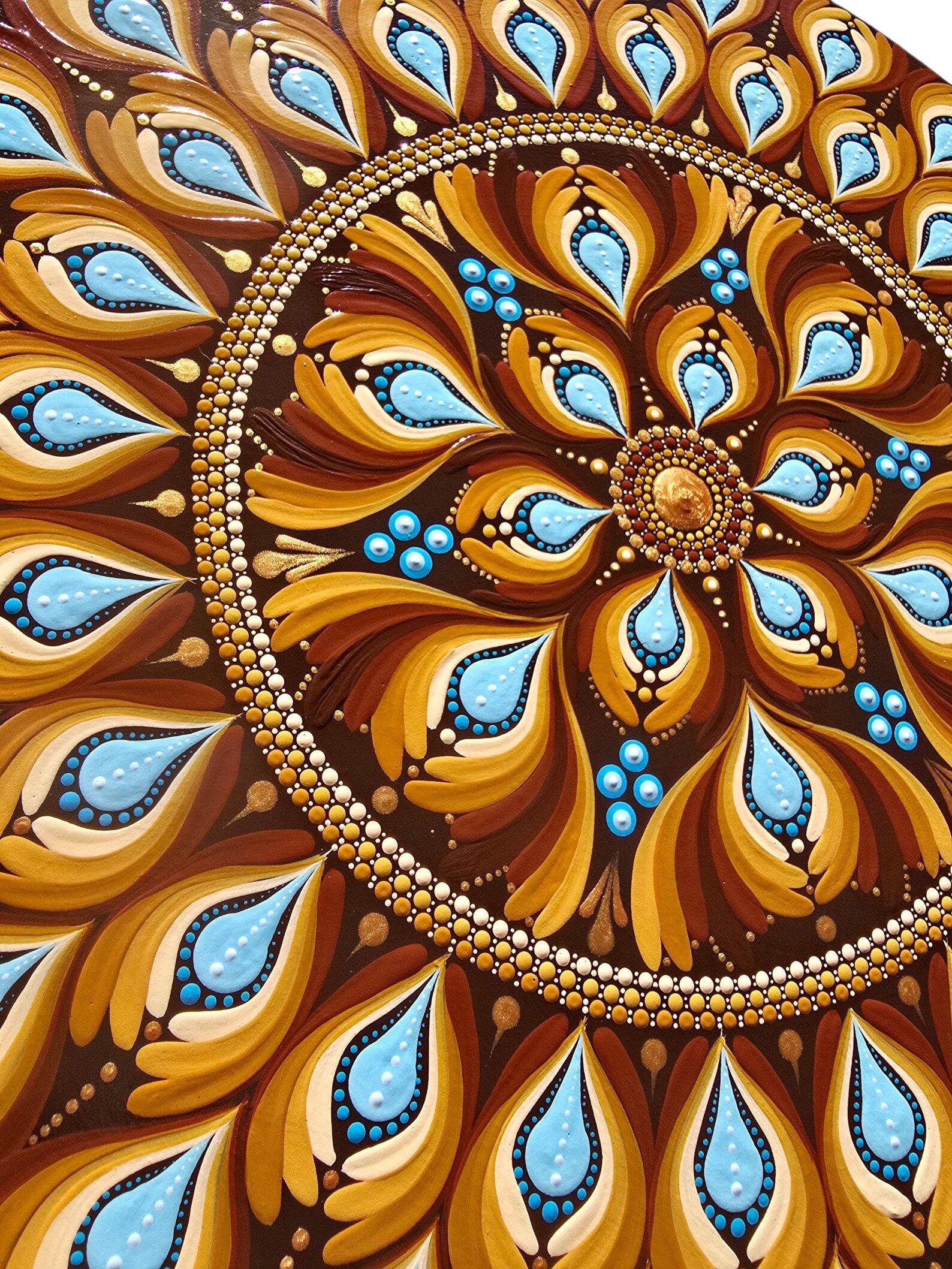 Tableau Mandala Pointillisme Marron Bleu 30cm – Art Mural Fait Main Zen