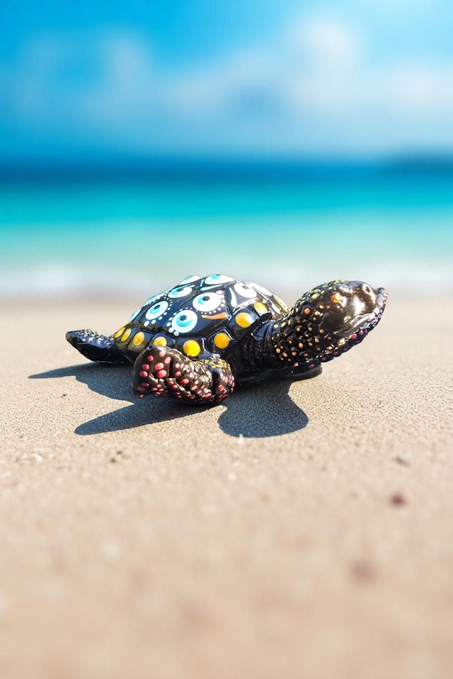 🎨 Sur sa carapace noire, chaque point a été soigneusement appliqué pour créer un motif hypnotique évoquant l'œil porte-bonheur. Son fini brillant met en valeur les détails en relief, lui donnant une allure à la fois artistique et symbolique.